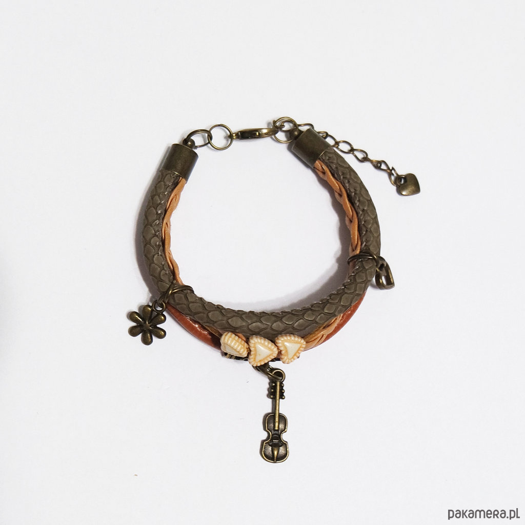 Bransoletka zrobiona jest z rzemieni ze skóry ekologicznej, sznurka oraz przekładek, zawieszek i koralików.