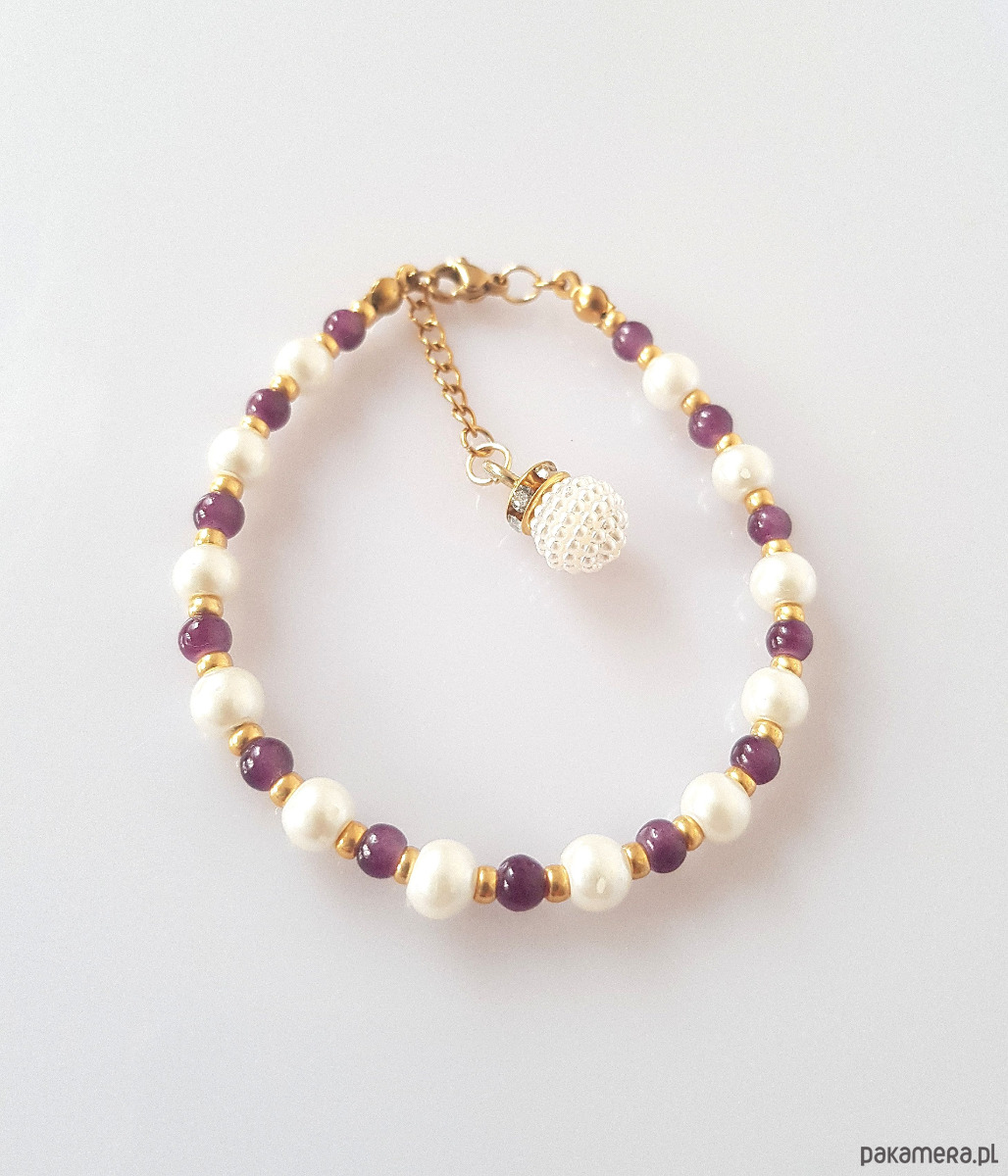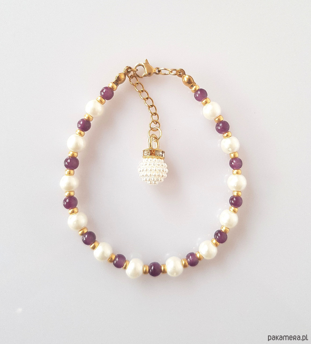 Drobne śliwkowe kulki jadeitu i białe perełki muszlowe.