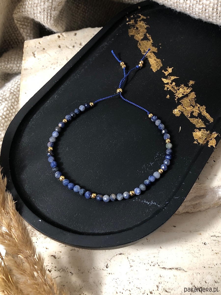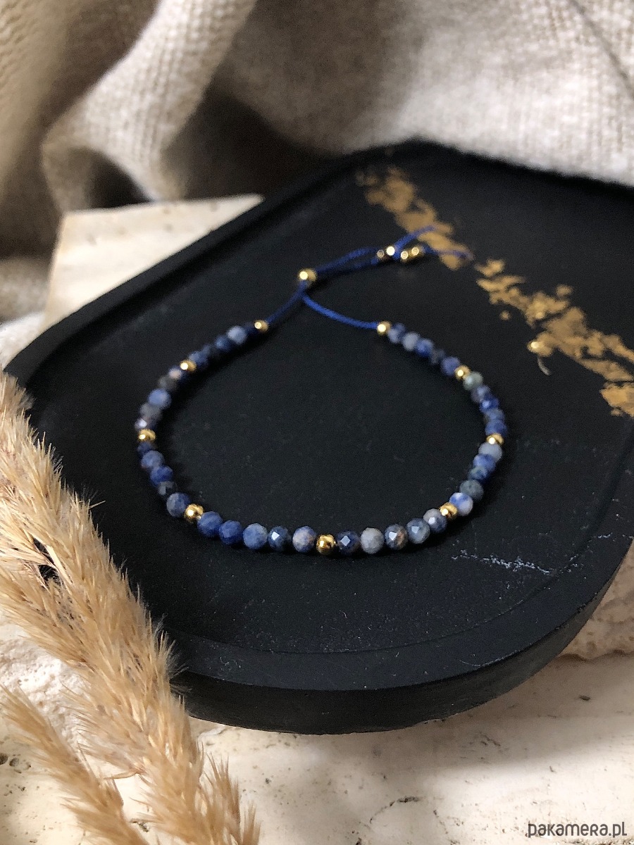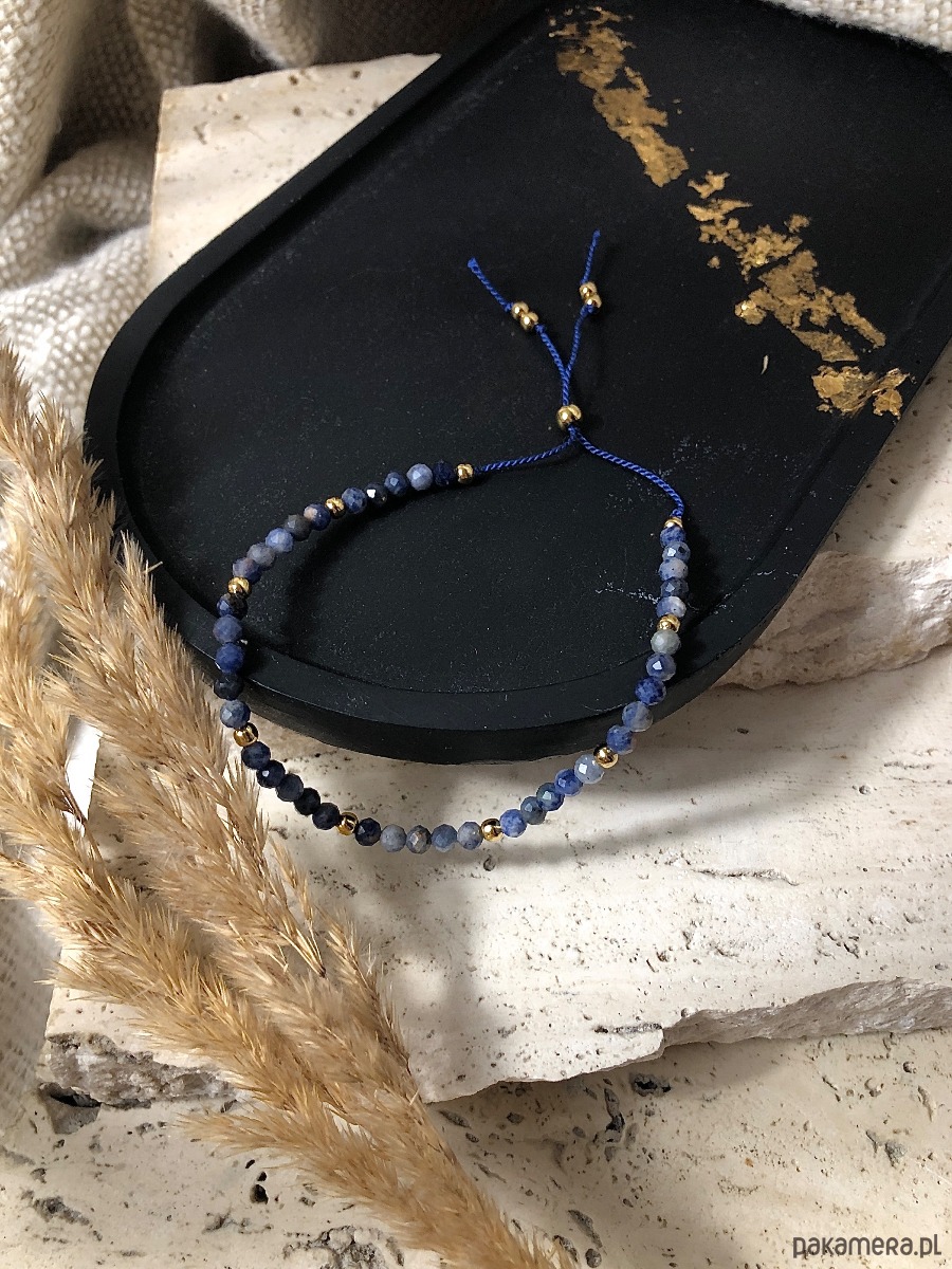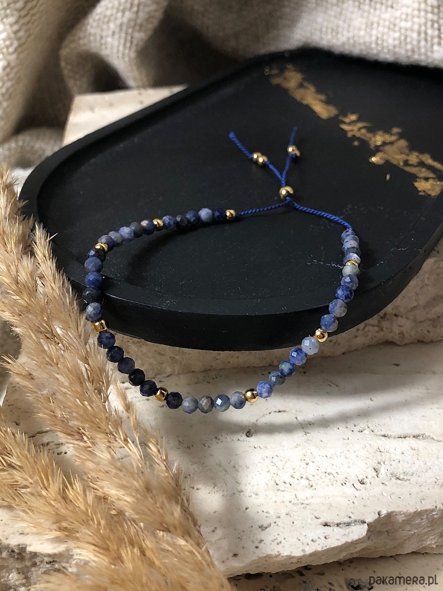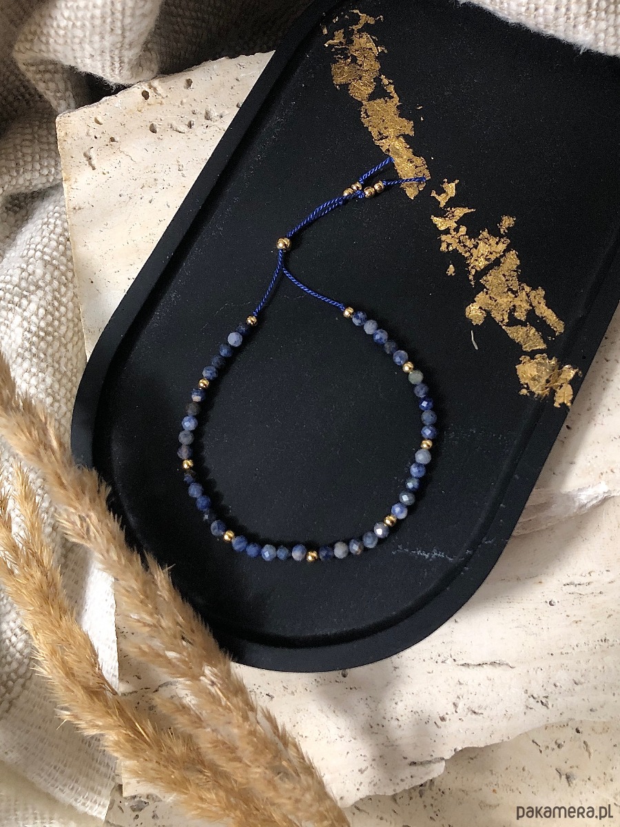 Bransoletka wykonana z kamieni naturalnych. Na nić jedwabną nawleczono sodalit o średnicy 3,5 mm oraz kuleczki ze stali chirurgicznej w kolorze złotym. Obwód bransoletki można regulować za pomocą przesuwanego stopera z gumką w środku.