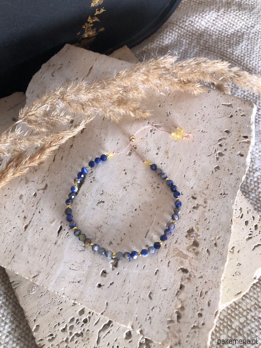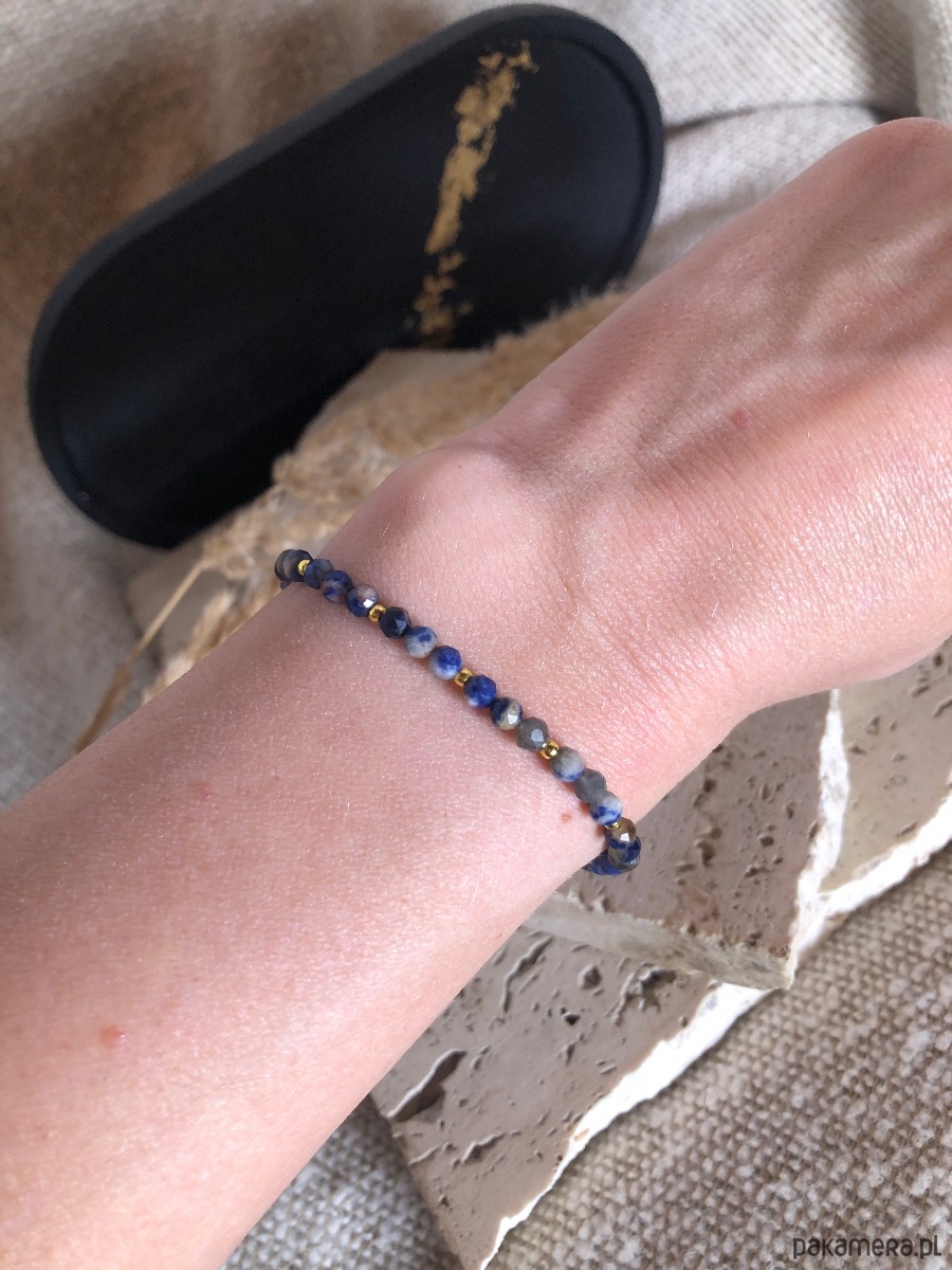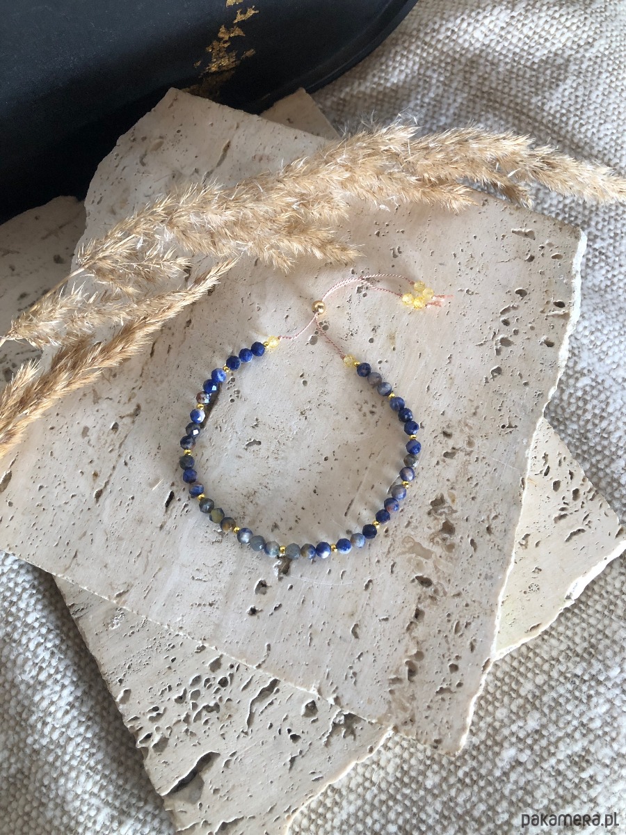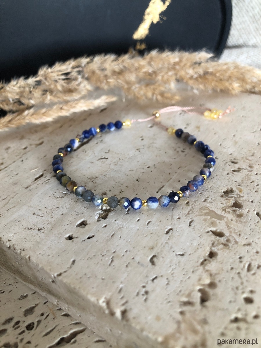 Bransoletka wykonana z kamieni naturalnych. Na nić jedwabną nawleczono sodalit o średnicy 4 mm, szklane kryształki oraz miedziane kuleczki w kolorze złota. Obwód bransoletki można regulować za pomocą przesuwanego stopera z gumką w środku.