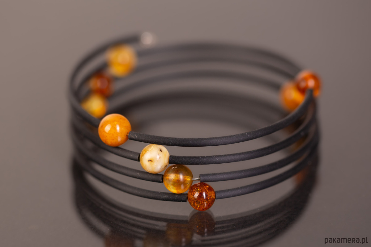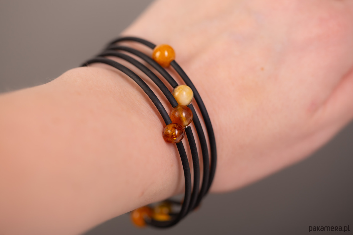 Forma i charakter: Sprężynowa elastyczność to jej główna zaleta — bransoletka jest uniwersalna, wygodna i nowoczesna. Kolorowe bursztynu tworzą naturalny gradient, który zmienia się wraz ze światłem.