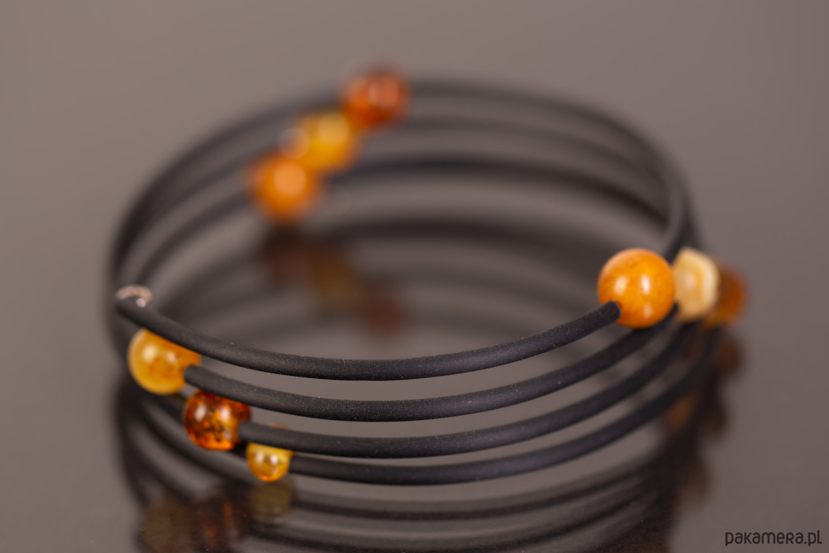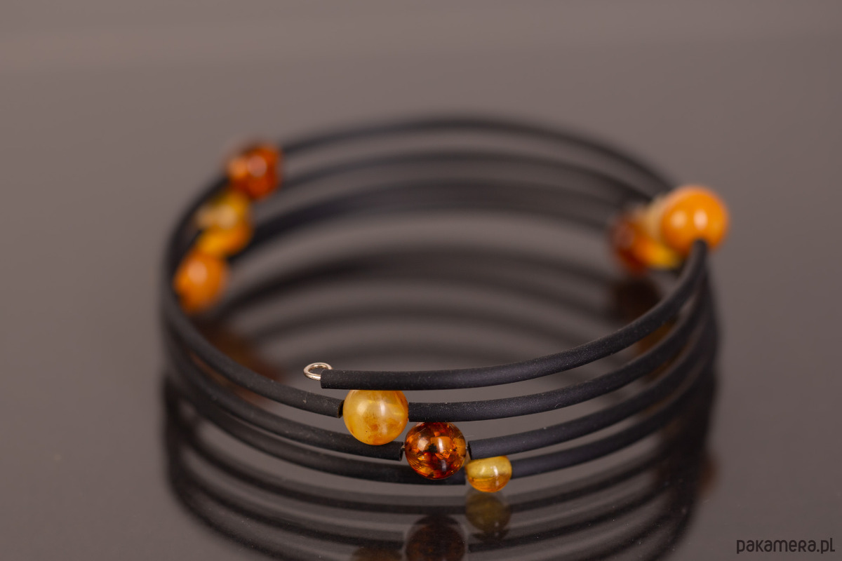 Unikalna, nowoczesna bransoletka, która układa się na ręce jak sprężyna — elastyczna i dostosowująca się do każdego rozmiaru dłoni. Dziesięć kulek bursztynu bałtyckiego w odcieniach od jasnego miodu po głęboką koniakową barwę jest ułożonych po ukosie w harmonijnej konfiguracji (3-3-4), tworząc wizualnie dynamiczną, rzeźbiarską kompozycję. Czarny, elastyczny rdzeń pozwala na swobodne noszenie bez zapięcia — po prostu nawija się na nadgarstek.