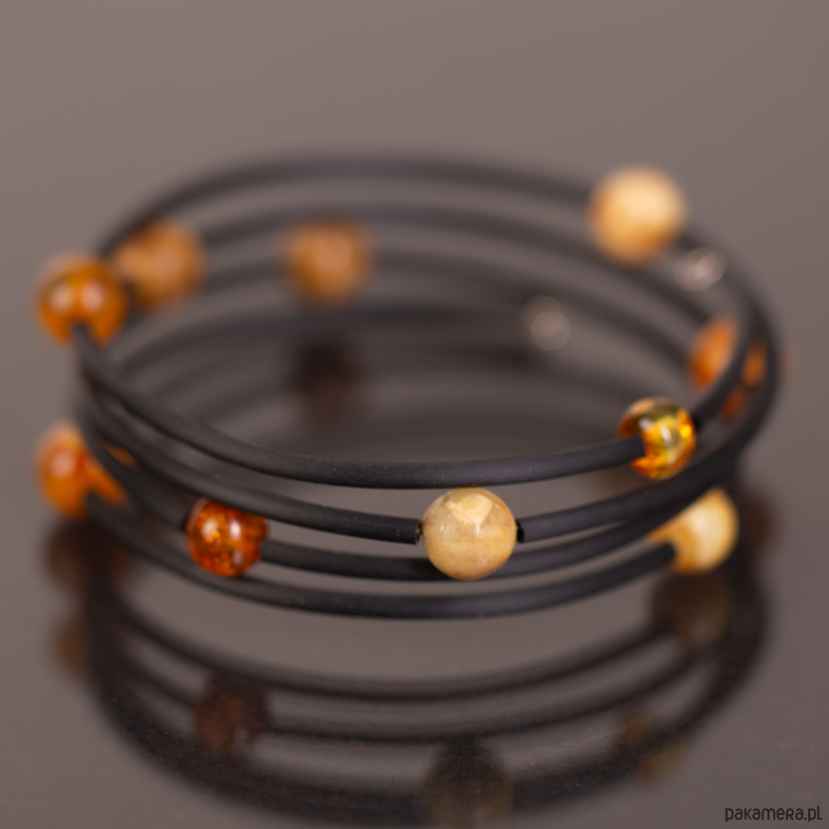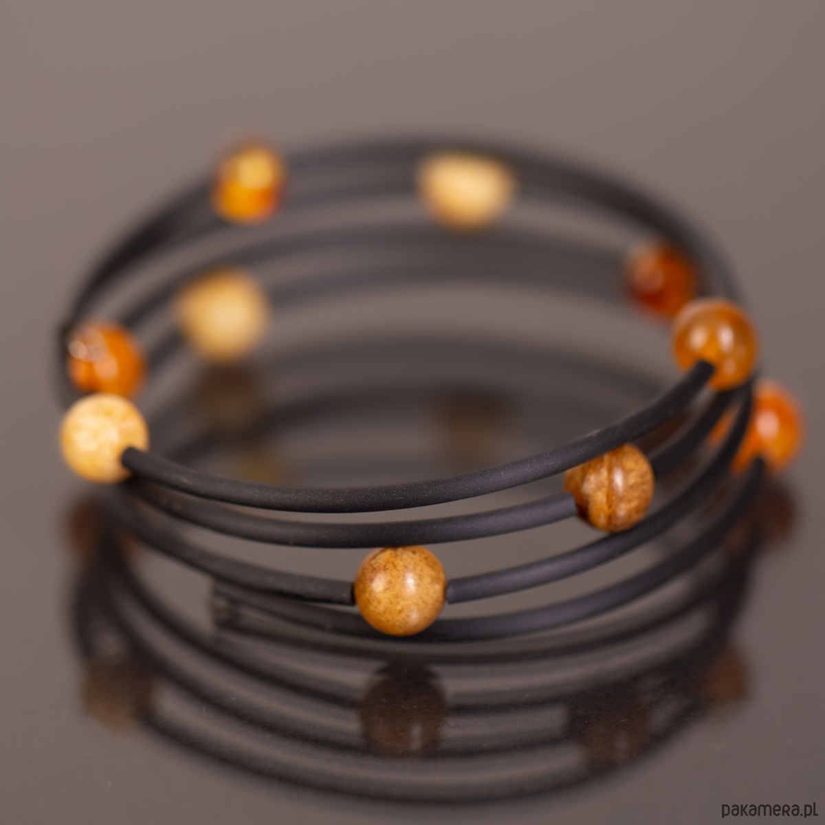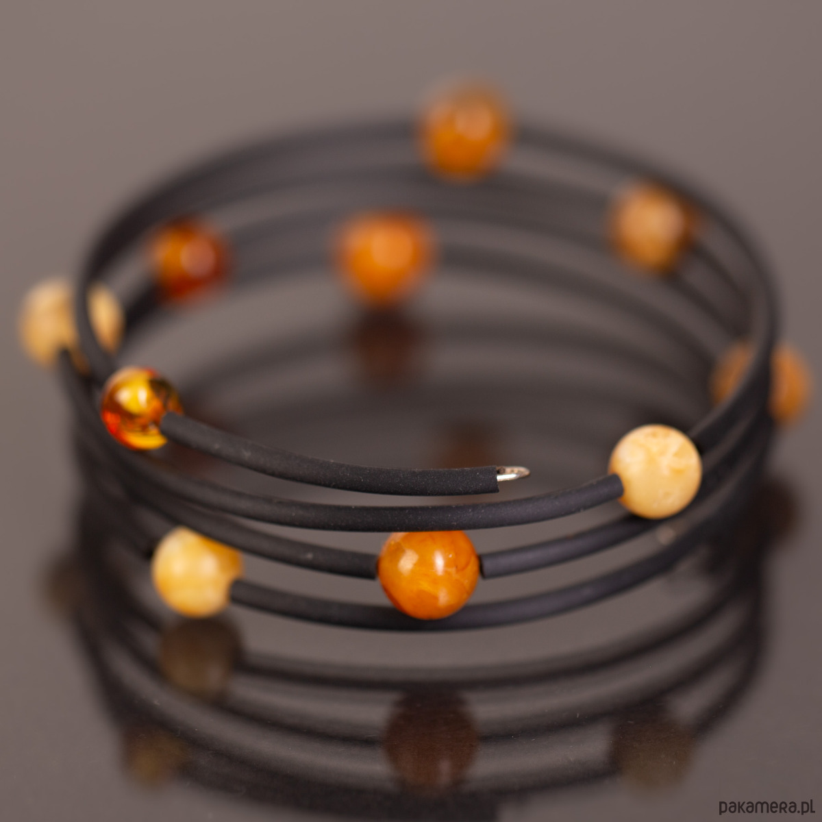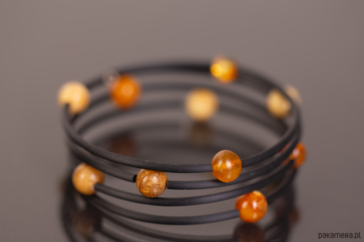 Unikalna, nowoczesna bransoletka, która układa się na ręce jak sprężyna — elastyczna i dostosowująca się do każdego rozmiaru dłoni. Dziesięć kulek bursztynu bałtyckiego w odcieniach od jasnego miodu po głęboką koniakową barwę jest ułożonych po ukosie w harmonijnej konfiguracji (3-3-4), tworząc wizualnie dynamiczną, rzeźbiarską kompozycję. Czarny, elastyczny rdzeń pozwala na swobodne noszenie bez zapięcia — po prostu nawija się na nadgarstek.