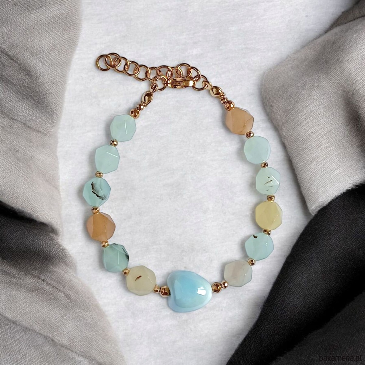 Bransoletka na solidnej lince stalowej (miękkiej) - została wykonana z wielobarwnego jadeitu amazonitowego o ciekawym szlifie (ok 8mm) ,przekładek ze złotego hematytu oraz ceramicznego serduszka (ok. 13mm) w kolorze błękitnym.