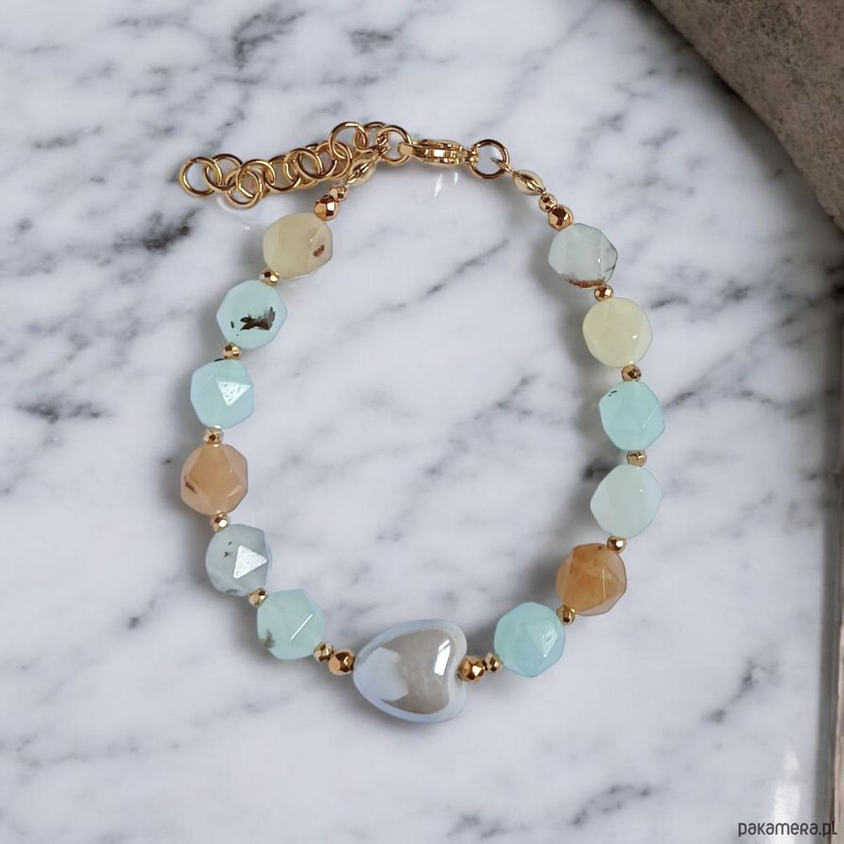 Bransoletka na solidnej lince stalowej (miękkiej) - została wykonana z wielobarwnego jadeitu amazonitowego o ciekawym szlifie (ok 8mm) ,przekładek ze złotego hematytu oraz ceramicznego serduszka (ok. 13mm) w kolorze szarym.