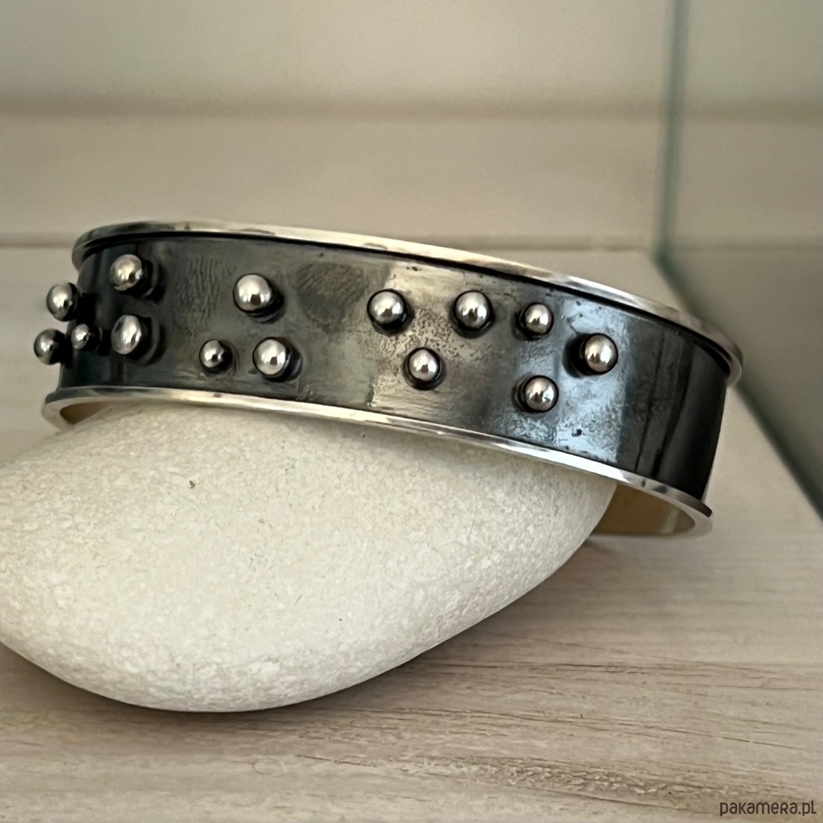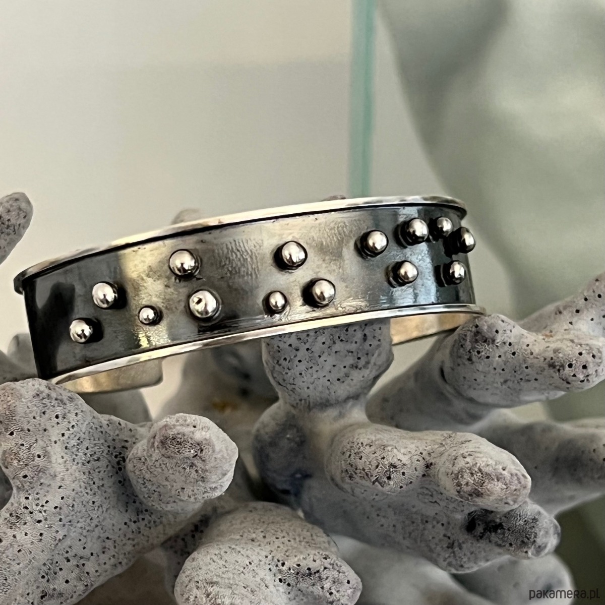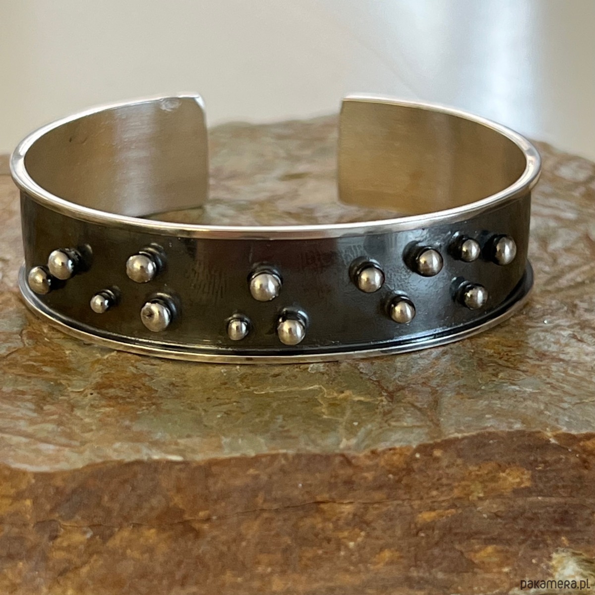 Bransoletka wykonana w oryginalnej technologii surowej, średniowiecznej. Materiał w całości stanowi oksydowane srebro 925, z maleńkimi kuleczkami srebra.