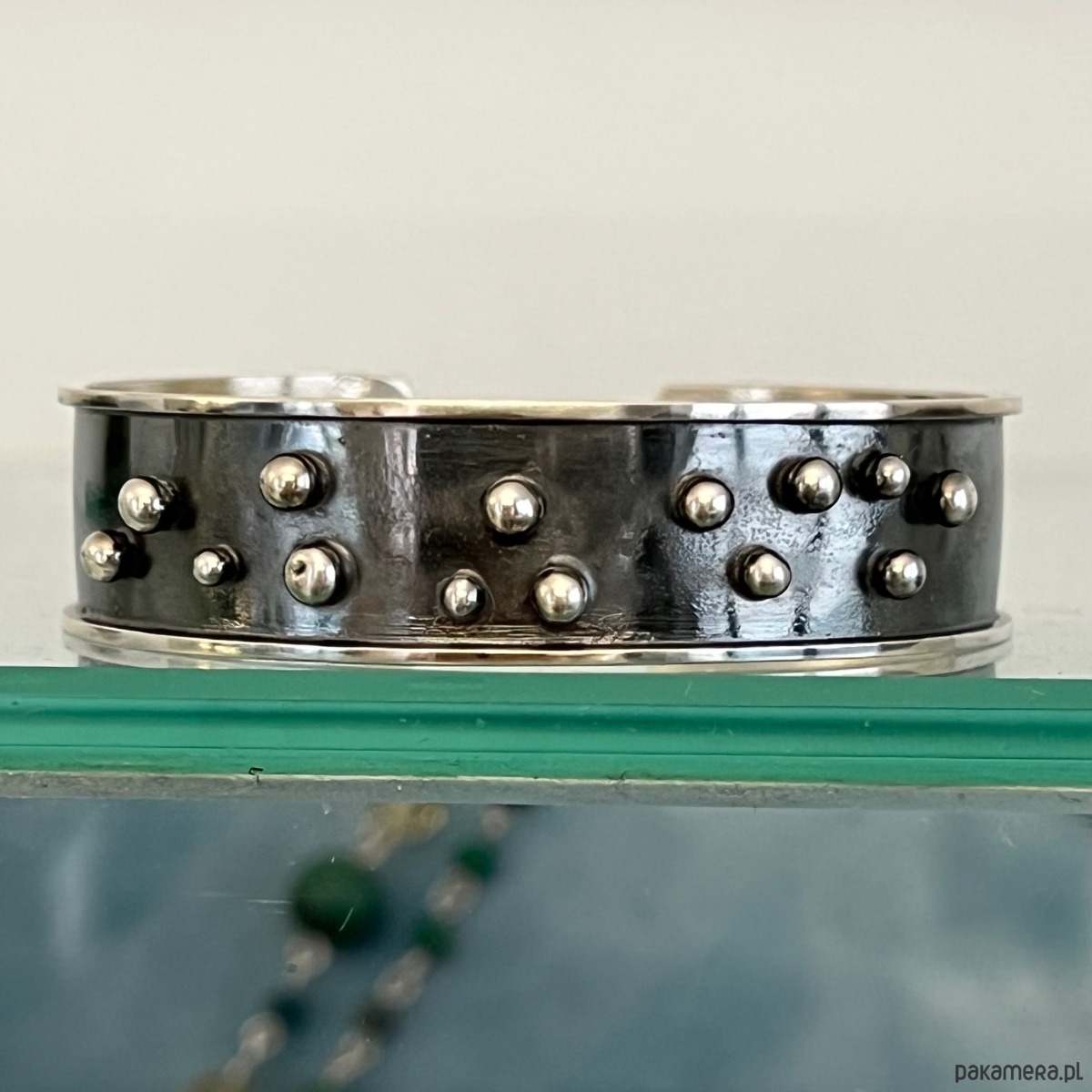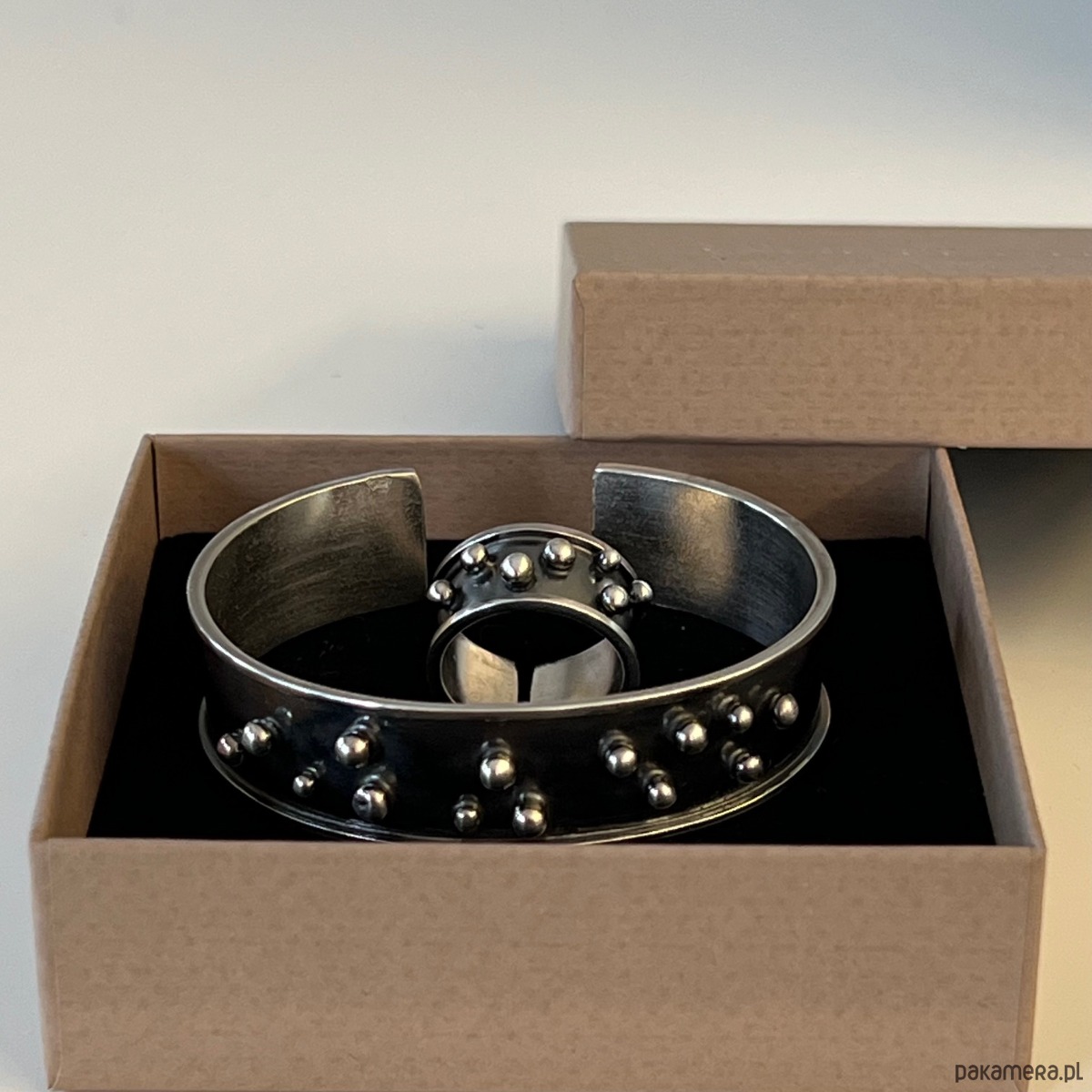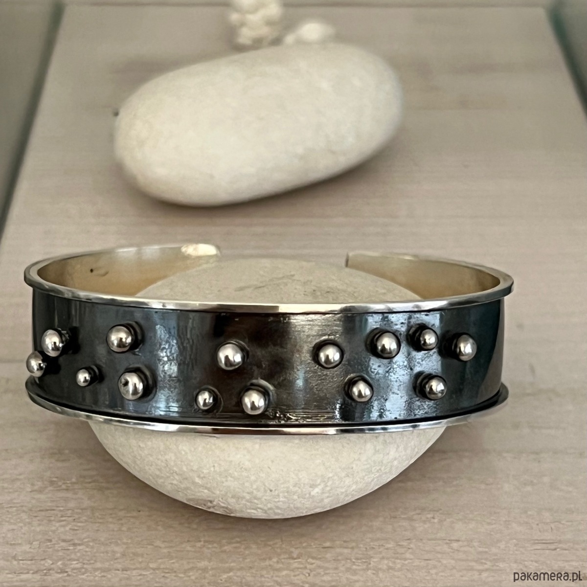 Bransoletka wykonana w oryginalnej technologii surowej, średniowiecznej. Materiał w całości stanowi oksydowane srebro 925, z maleńkimi kuleczkami srebra.