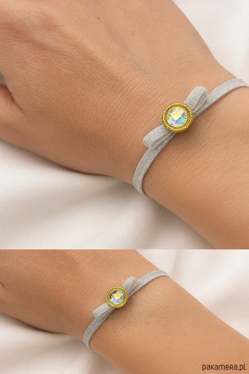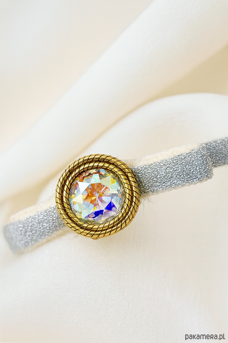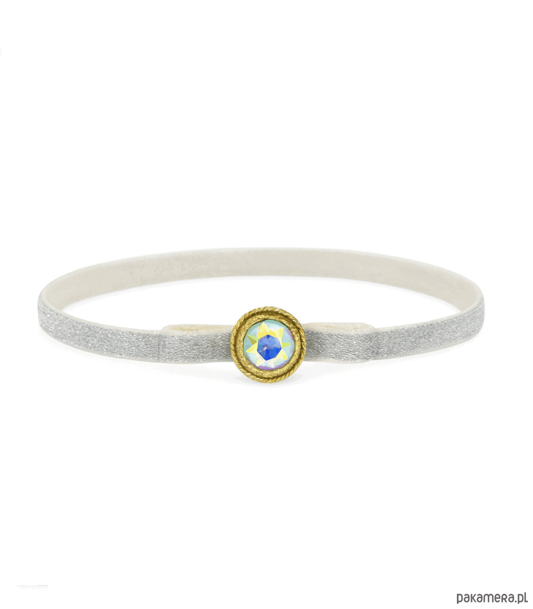 Serce bransoletki stanowi kryształ Swarovski, opalizujący wielobarwnym blaskiem. Został on starannie osadzony w złotej tasiemce sutasz, tworzącej elegancką, dekoracyjną oprawę o luksusowym wykończeniu.