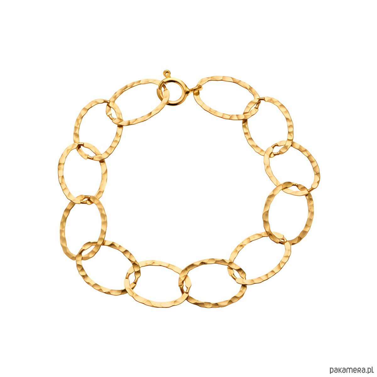 Pozłacana bransoletka z dużymi ogniwami to wyrazisty, a jednocześnie ponadczasowy akcent, który doda charakteru każdej stylizacji. Ręcznie wykonana ze srebra 925 pokrytego grubą warstwą złota, zachwyca elegancją i subtelnym połyskiem. Młotkowana faktura ogniw pięknie odbija światło, tworząc niepowtarzalny efekt. Każdy egzemplarz to małe dzieło sztuki – samodzielna ozdoba, która nie potrzebuje towarzystwa innych dodatków.