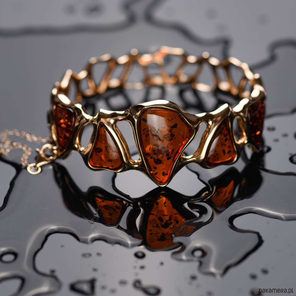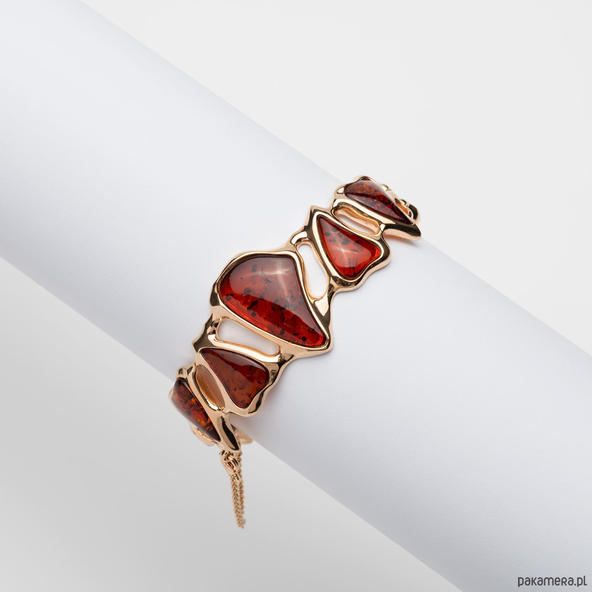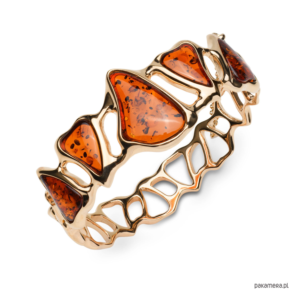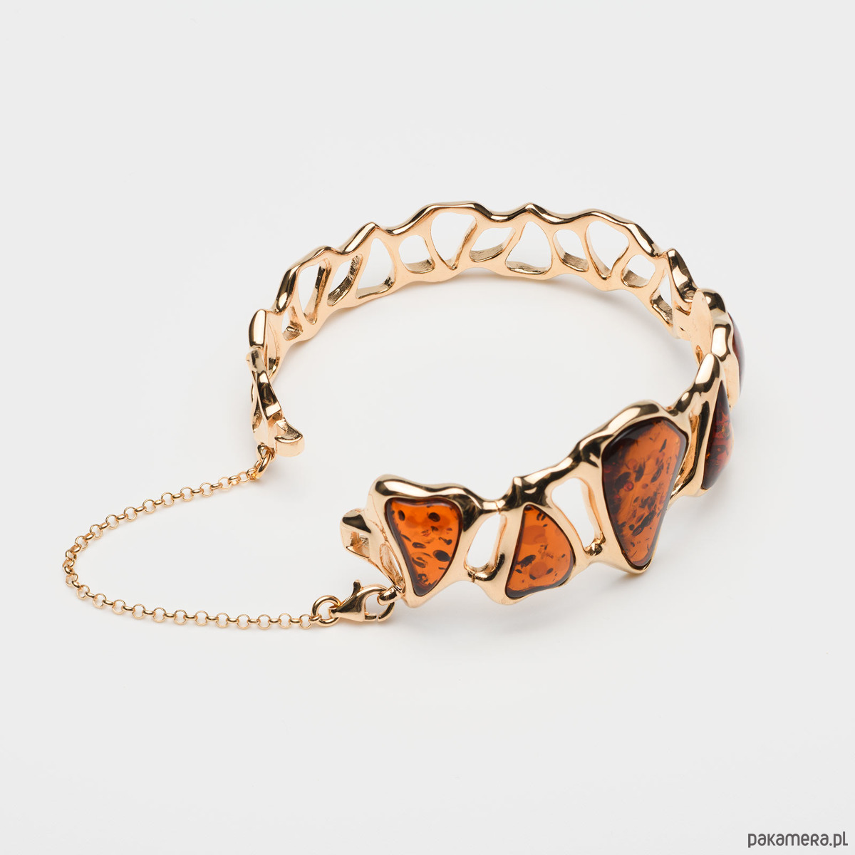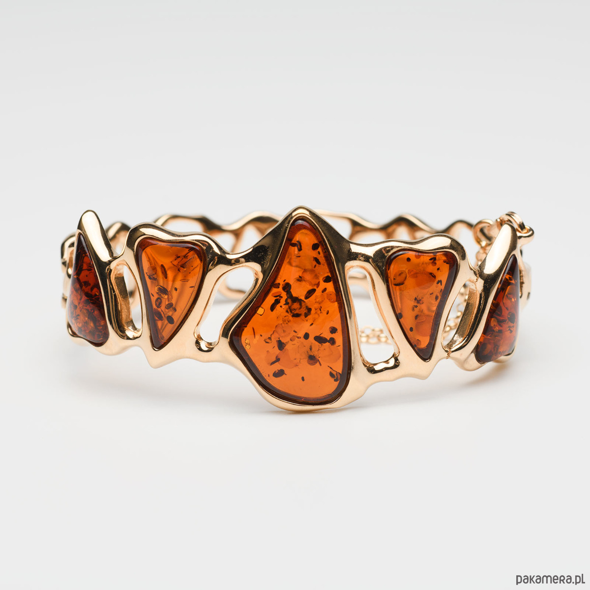 Bransoleta srebrna próby 925 , pozłacana 24 karatowym złotem z naturalnym bursztynem, pięknie zaprojektowana przez artystę plastyka. Bursztyn wielokolorowy.