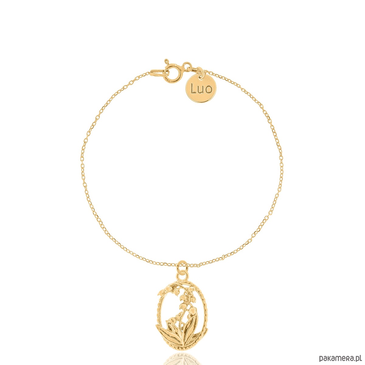 Bransoletka srebrna pozłacana z kwiatem konwalią. Całość wykonana ze srebra 925 pokrytego 24 karatowym żółtym złotem.