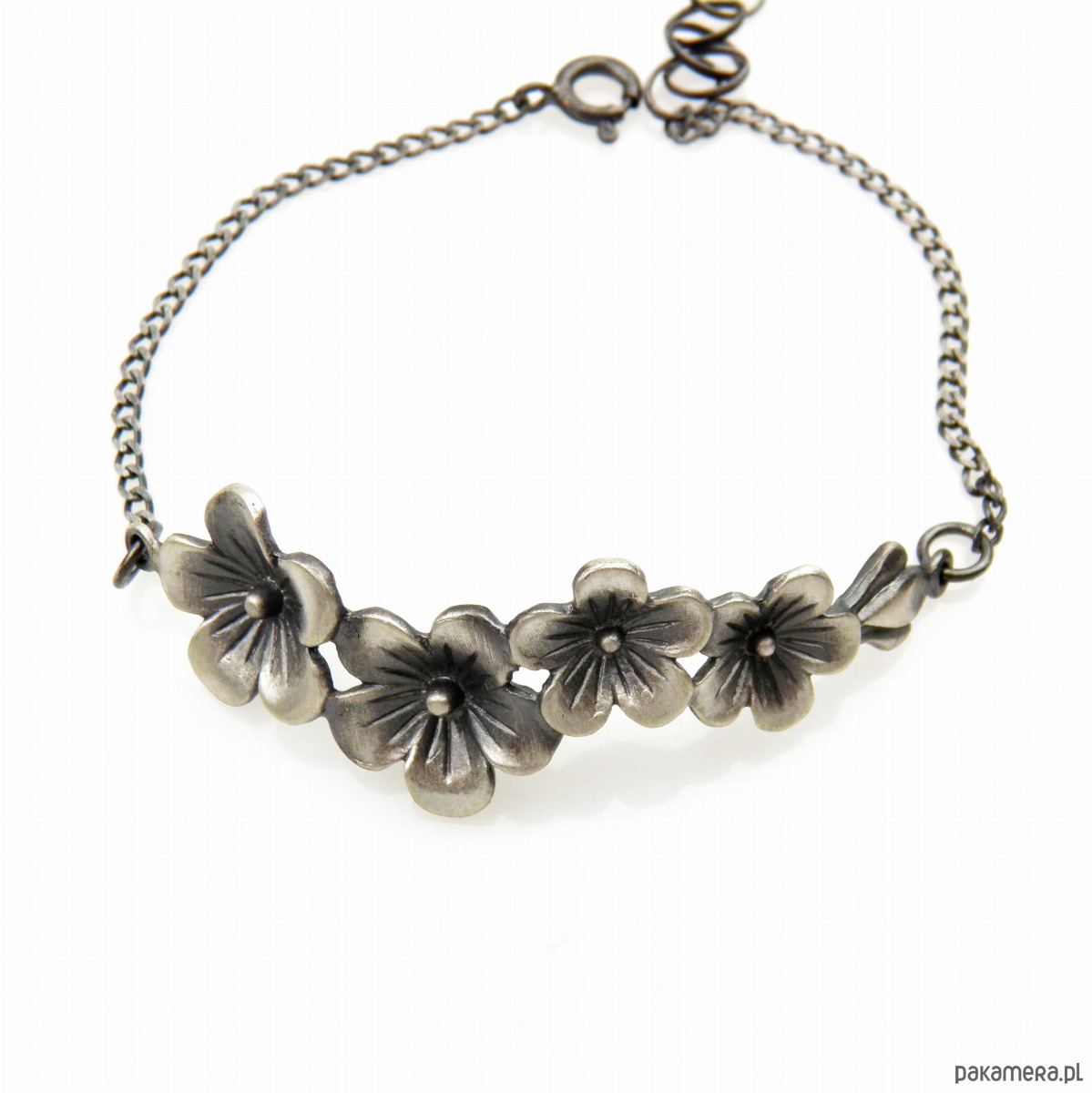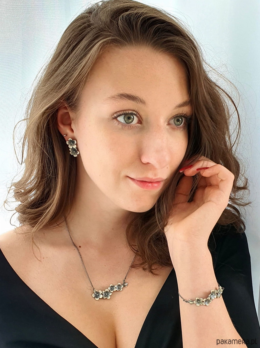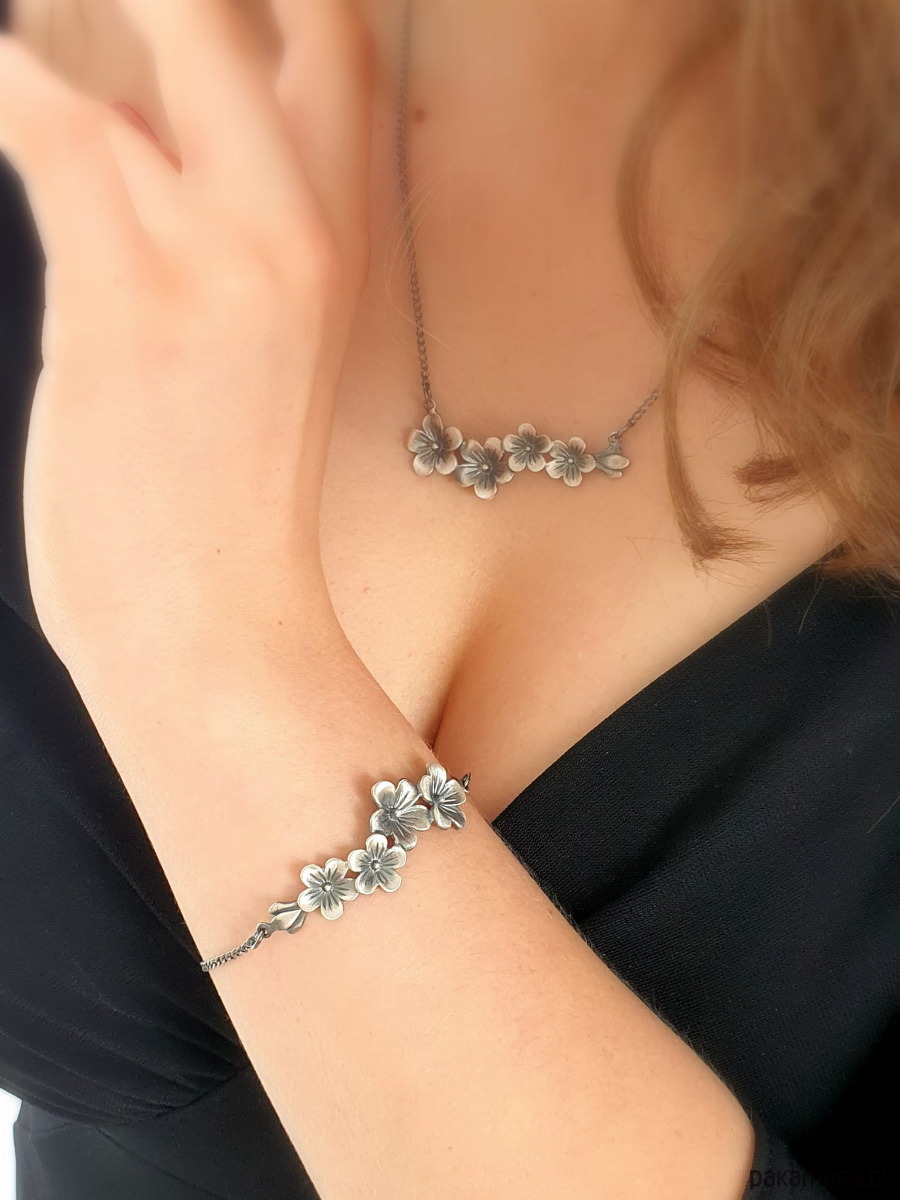 Wyjątkowy Design: Bransoletka zdobiona jest delikatnymi kwiatuszkami barwinka, które zamknięte są w ozdobnym elemencie. Grafitowe wykończenie dodaje całości elegancji i subtelnego uroku, idealnie podkreślając piękno srebra.