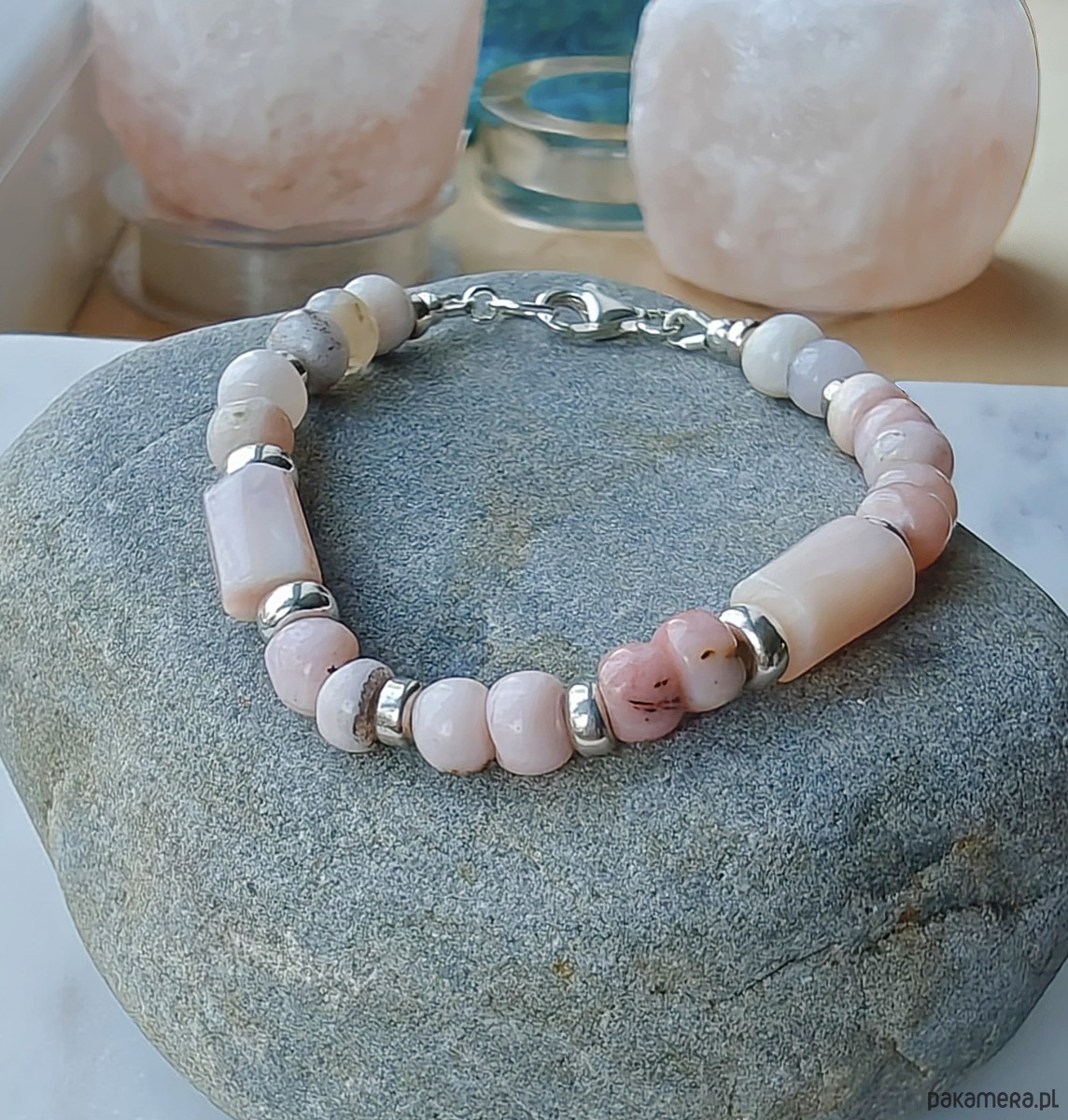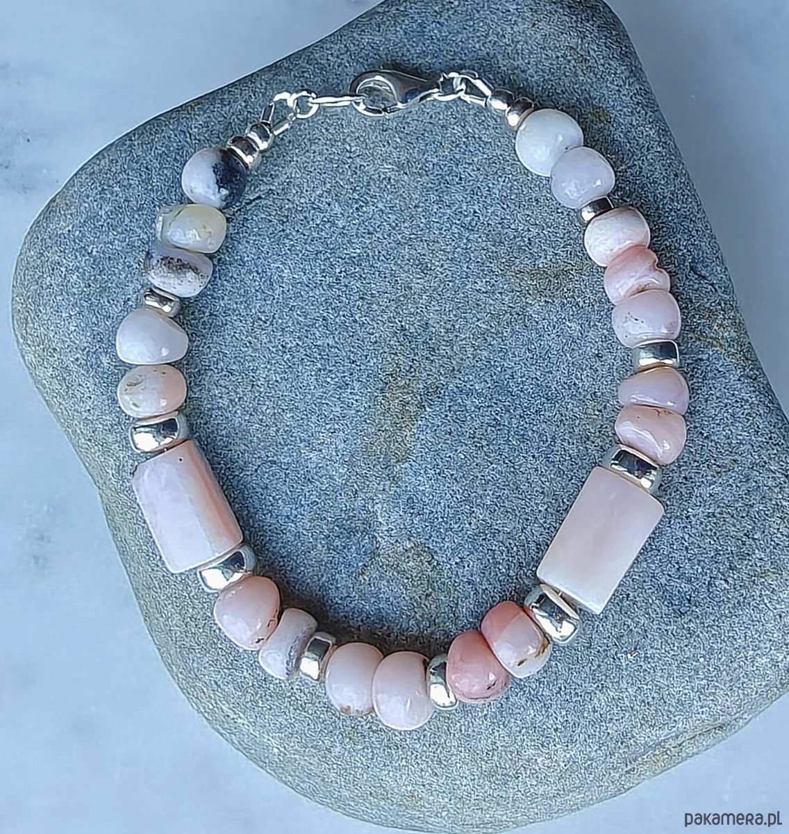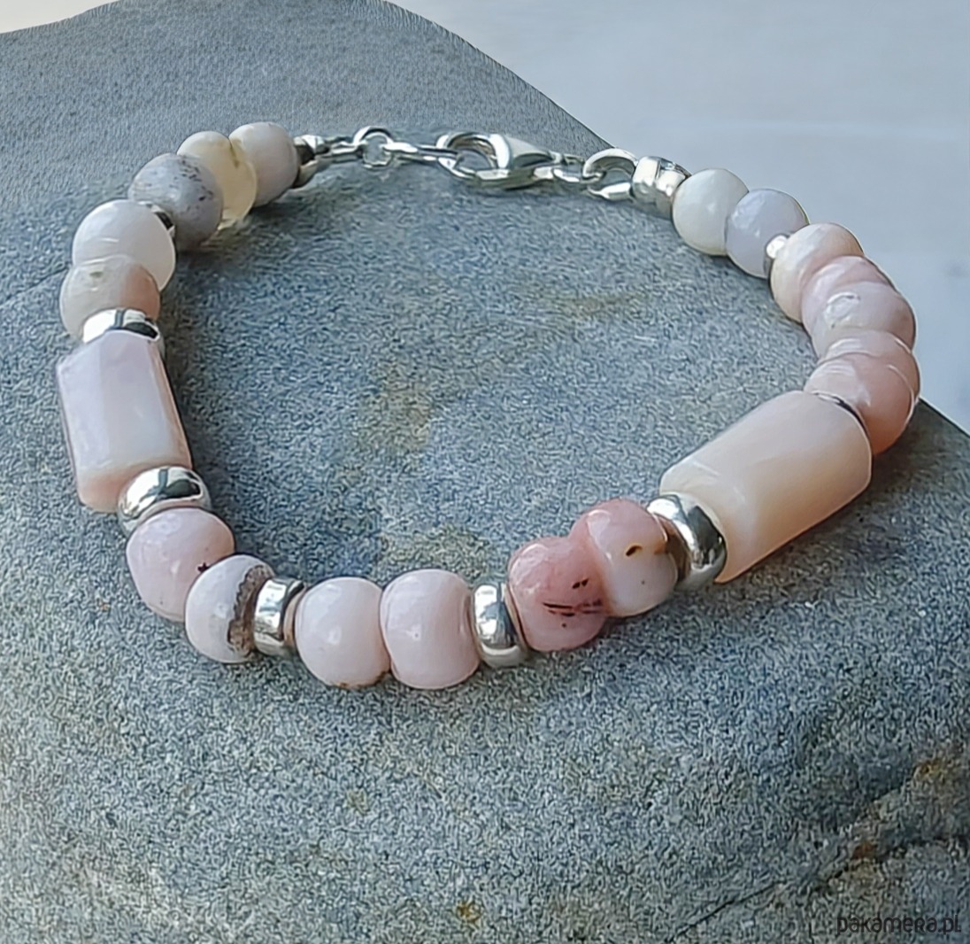 Bransoletka z pastelowych, różowych opali peruwiańskich z dodatkiem srebra. Kamienie są ułożone wg odcieni, można znaleźć sekwencje mocniejszego i bladego różu. Grube oponki są nieregularne, mają miejscami ciemniejsze piegi.