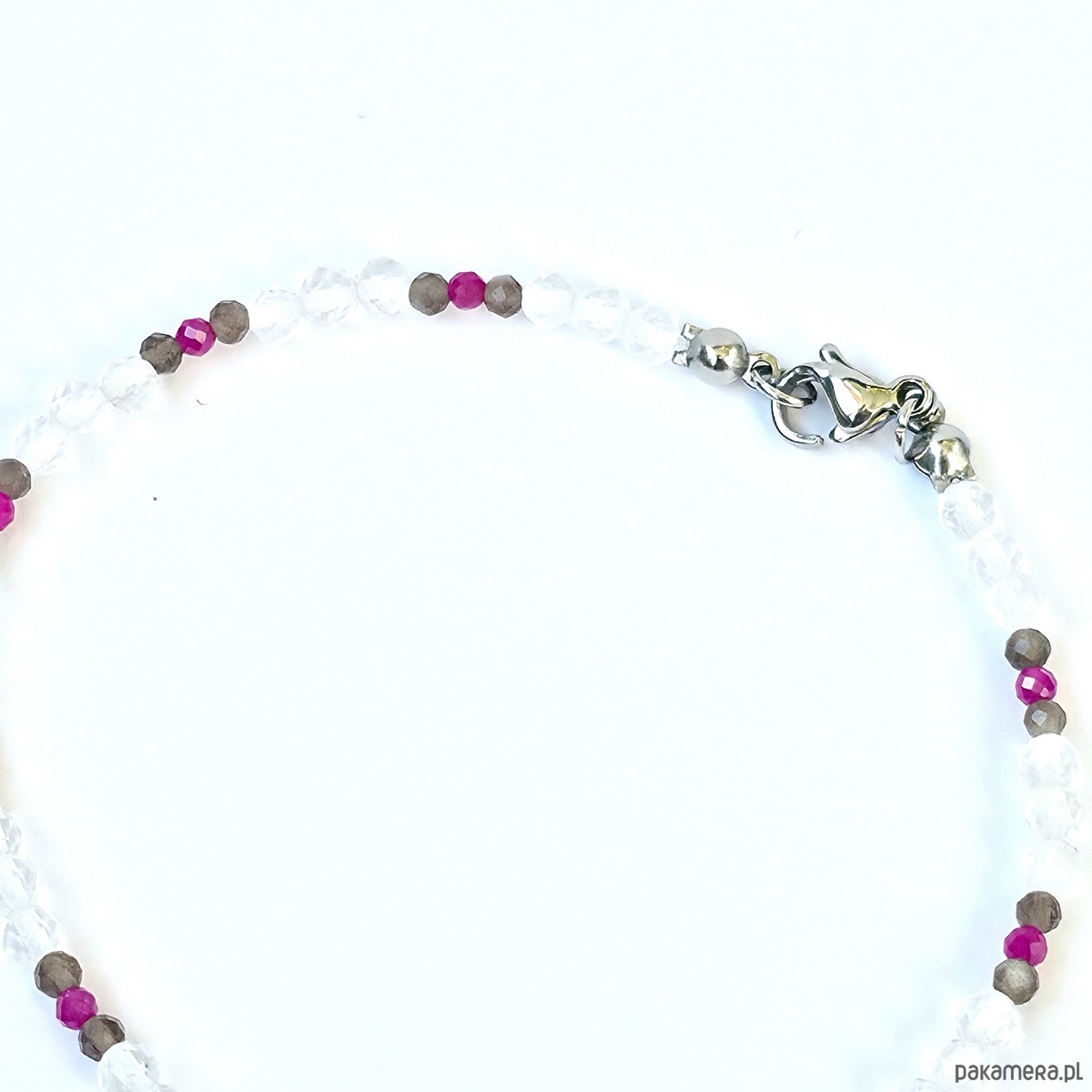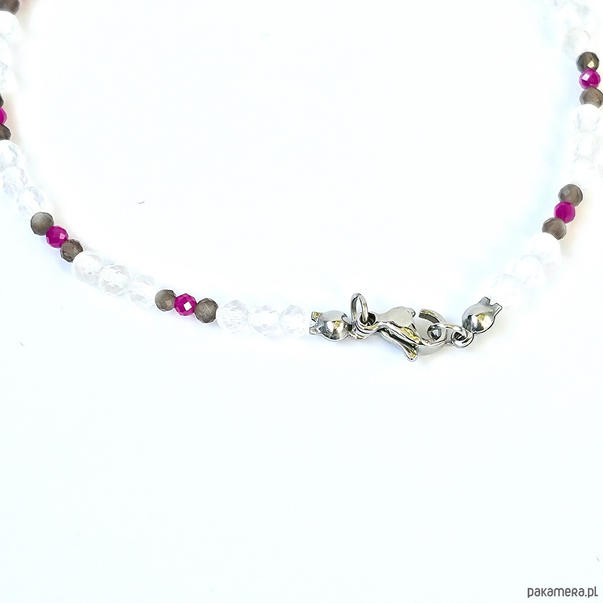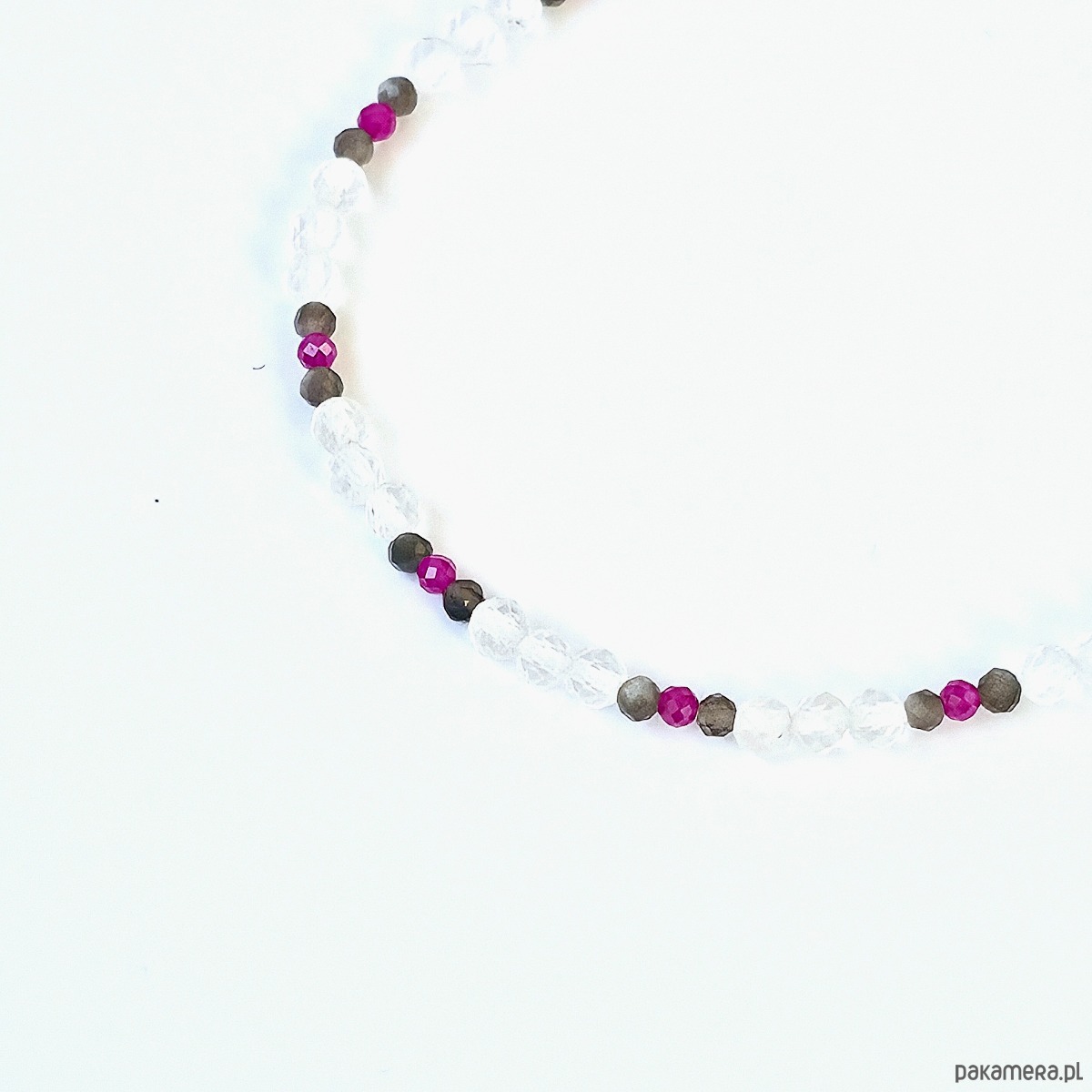 • Materiały: Rubin, Obsydian srebrzysty, Kryształ Górski, stal chirurgiczna, żyłka wędkarska Fluorocarbon.
