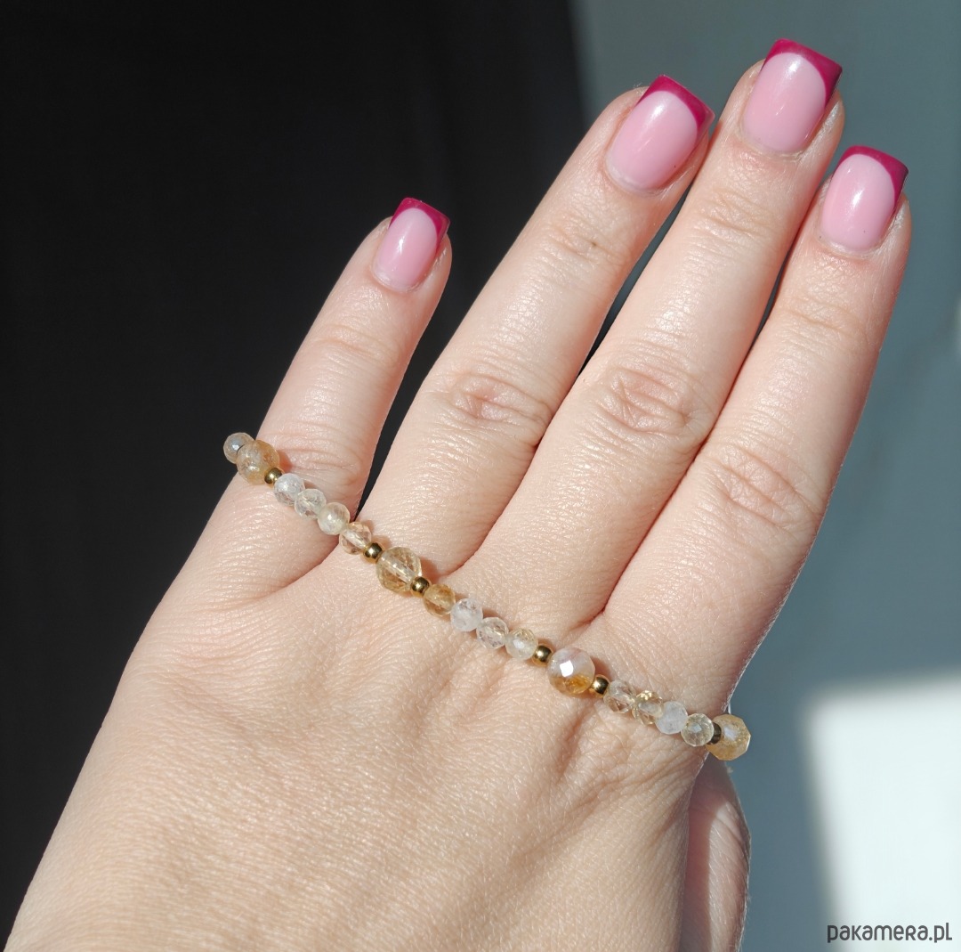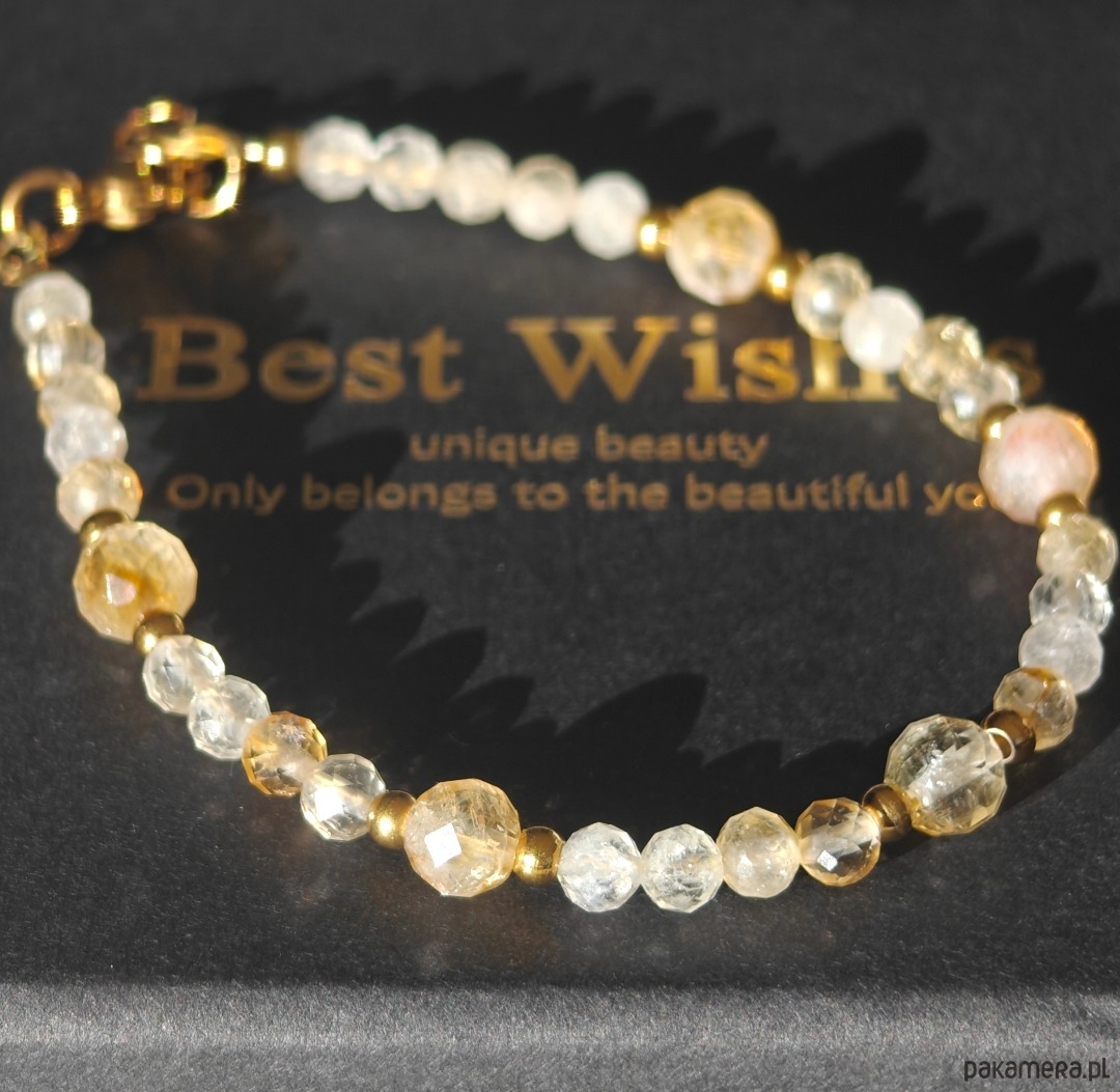 Bransoletka wykonana z cytrynu w delikatnych, słonecznych odcieniach, które dodają lekkości i subtelnego blasku. Długość bransoletki to 18,5 cm + 1 cm przedłużki, co pozwala na wygodne dopasowanie do nadgarstka.
