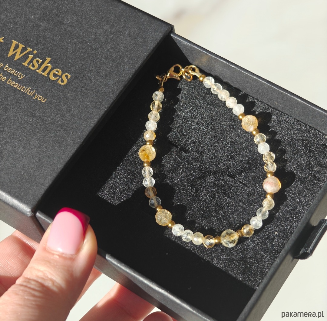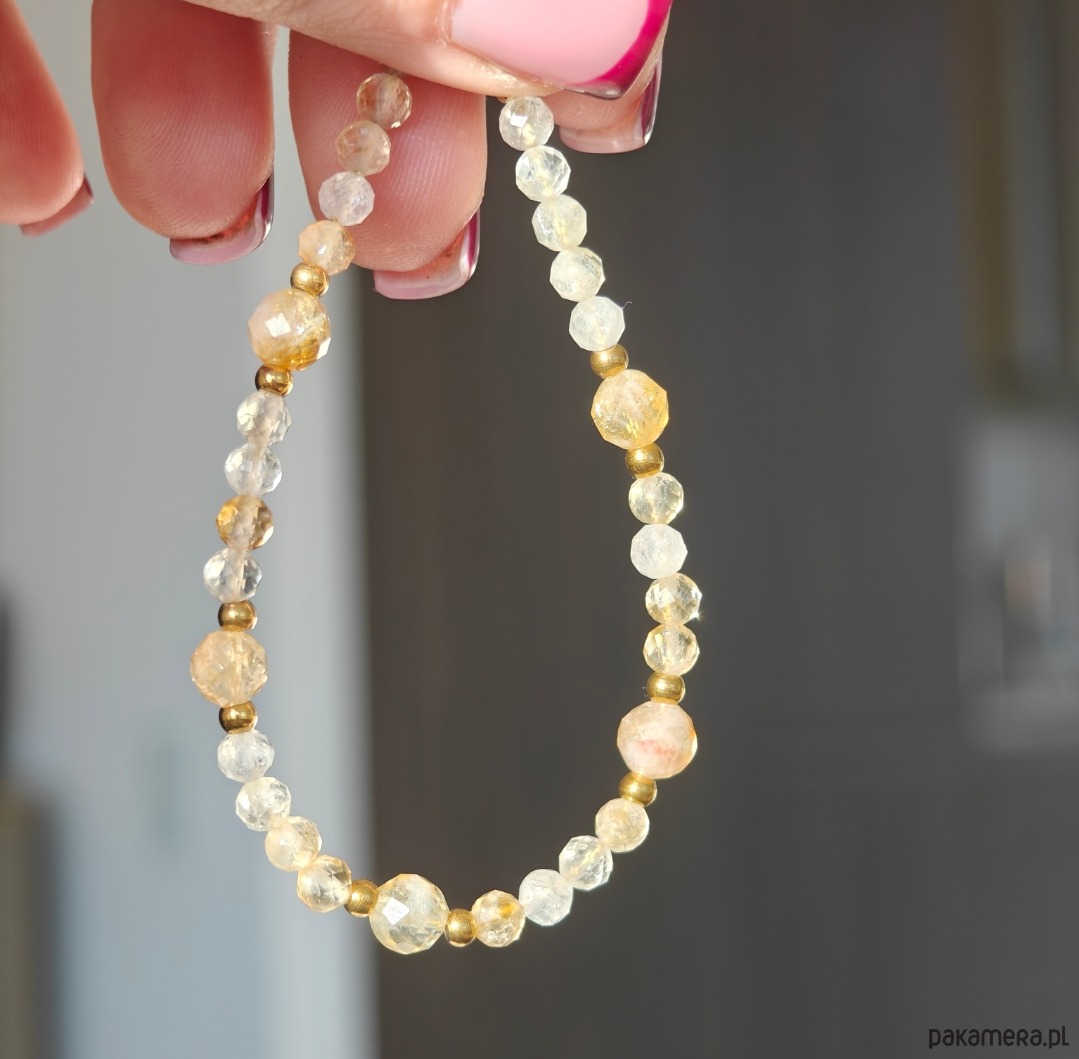 Bransoletka wykonana z cytrynu w delikatnych, słonecznych odcieniach, które dodają lekkości i subtelnego blasku. Długość bransoletki to 18,5 cm + 1 cm przedłużki, co pozwala na wygodne dopasowanie do nadgarstka.