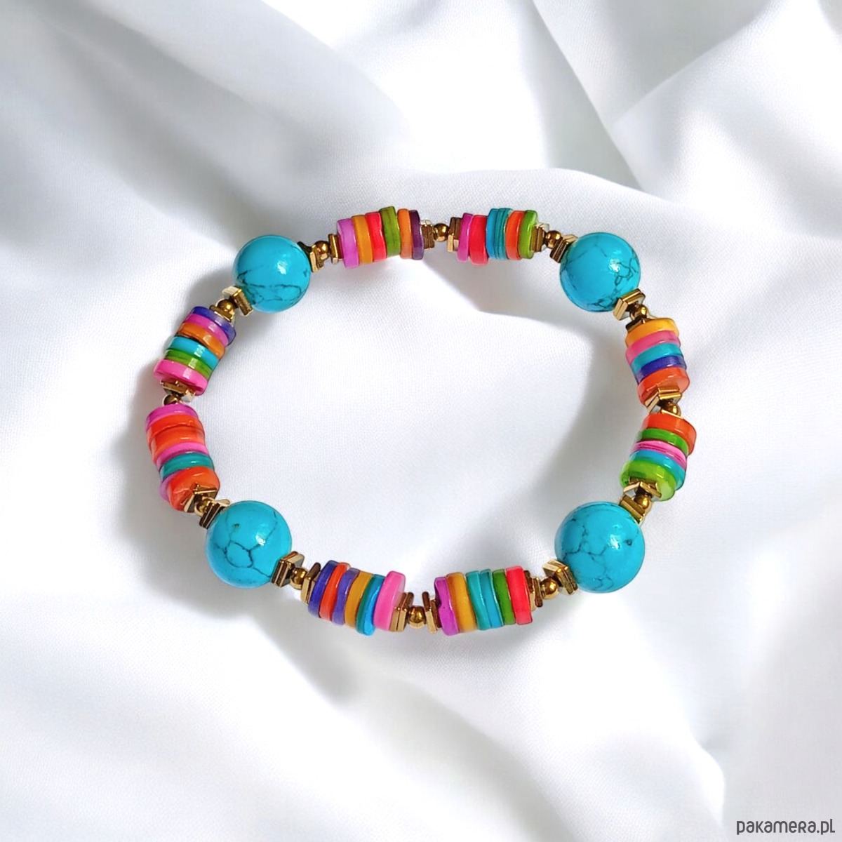 Okazała, masywna i bardzo efektowna bransoletka na solidnej gumce jubilerskiej- została wykonana z kolorowej muszli (plastry ok.8mm), dużych kul turkusowego howlitu (ok.12mm), złotego hematytu (przekładki).