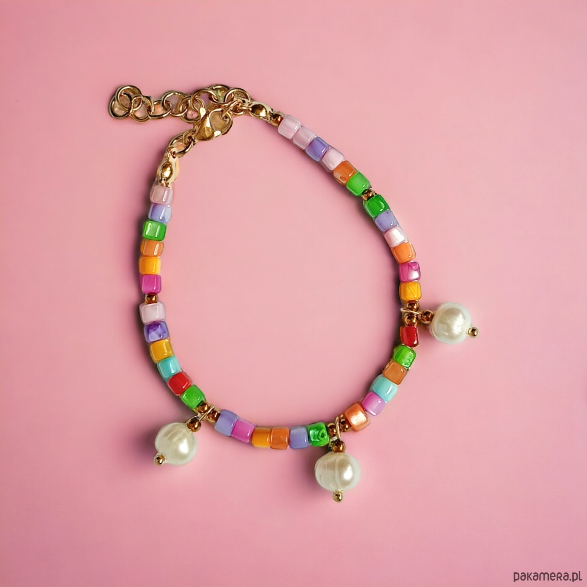 Bransoletka na solidnej lince stalowej (miękkiej) - została wykonana z kolorowej muszli (wałeczki 3x4mm), przekładek ze złotego hematytu oraz naturalnych pereł słodkowodnych 7-8mm.