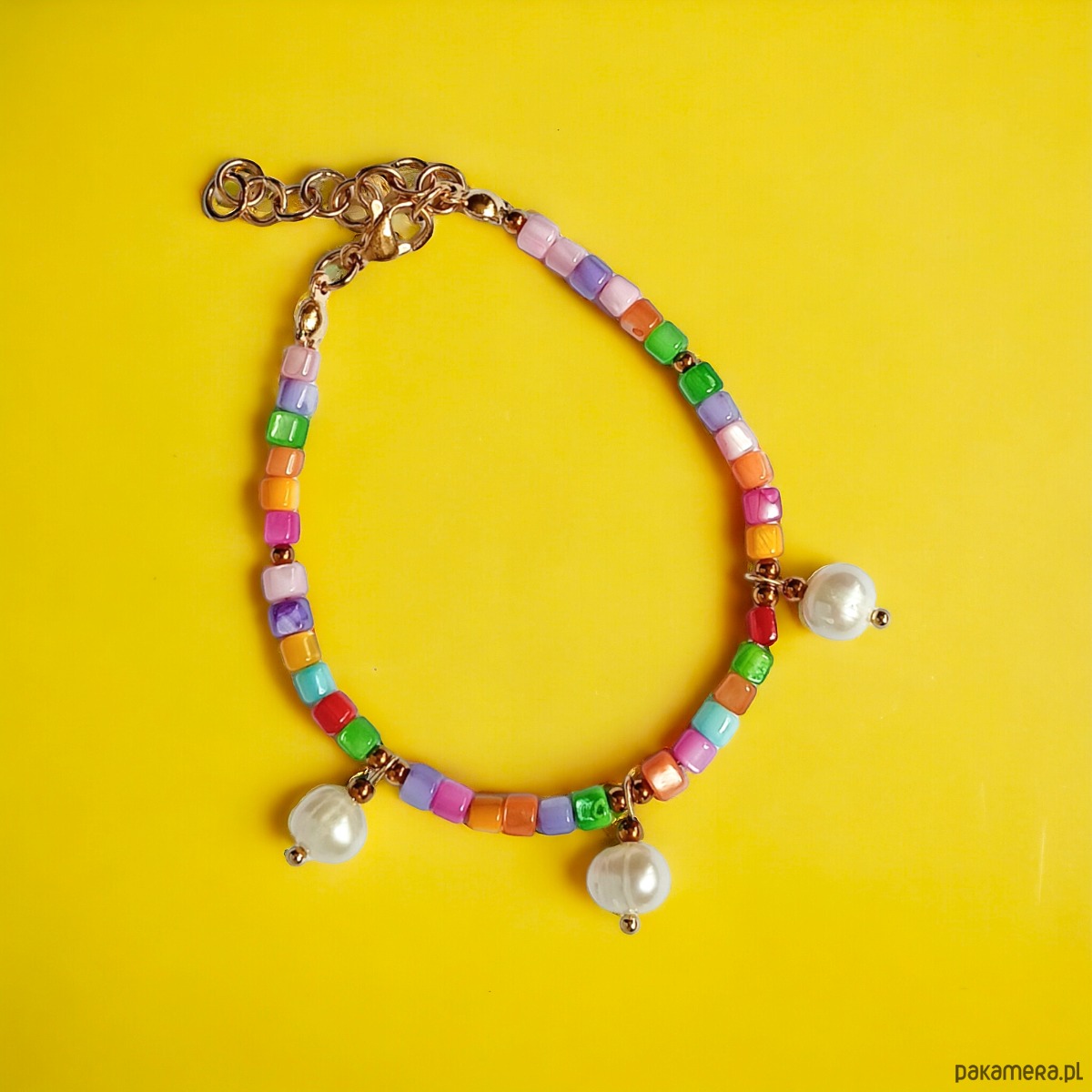Bransoletka na solidnej lince stalowej (miękkiej) - została wykonana z kolorowej muszli (wałeczki 3x4mm), przekładek ze złotego hematytu oraz naturalnych pereł słodkowodnych 7-8mm.