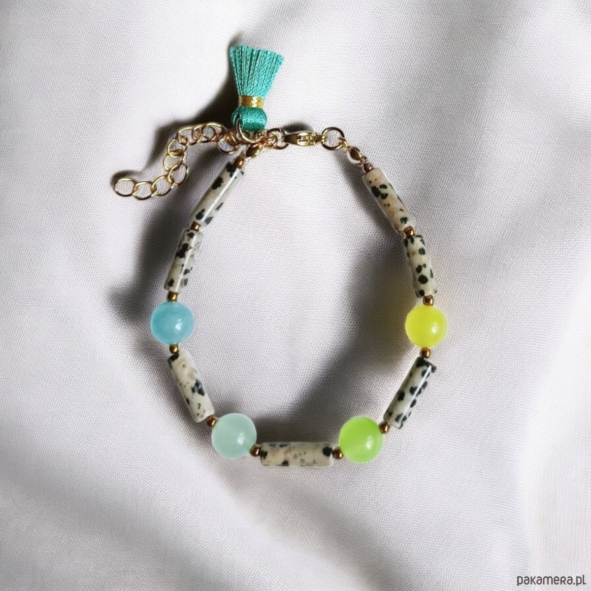 Efektowna bransoletka na solidnej lince jubilerskiej - został wykonany w całości z kamieni naturalnych - jaspis dalmatyński (pałeczki ok. 4x13mm), jadeitu (kule 8mm) i przekładek ze złotego hematytu.
