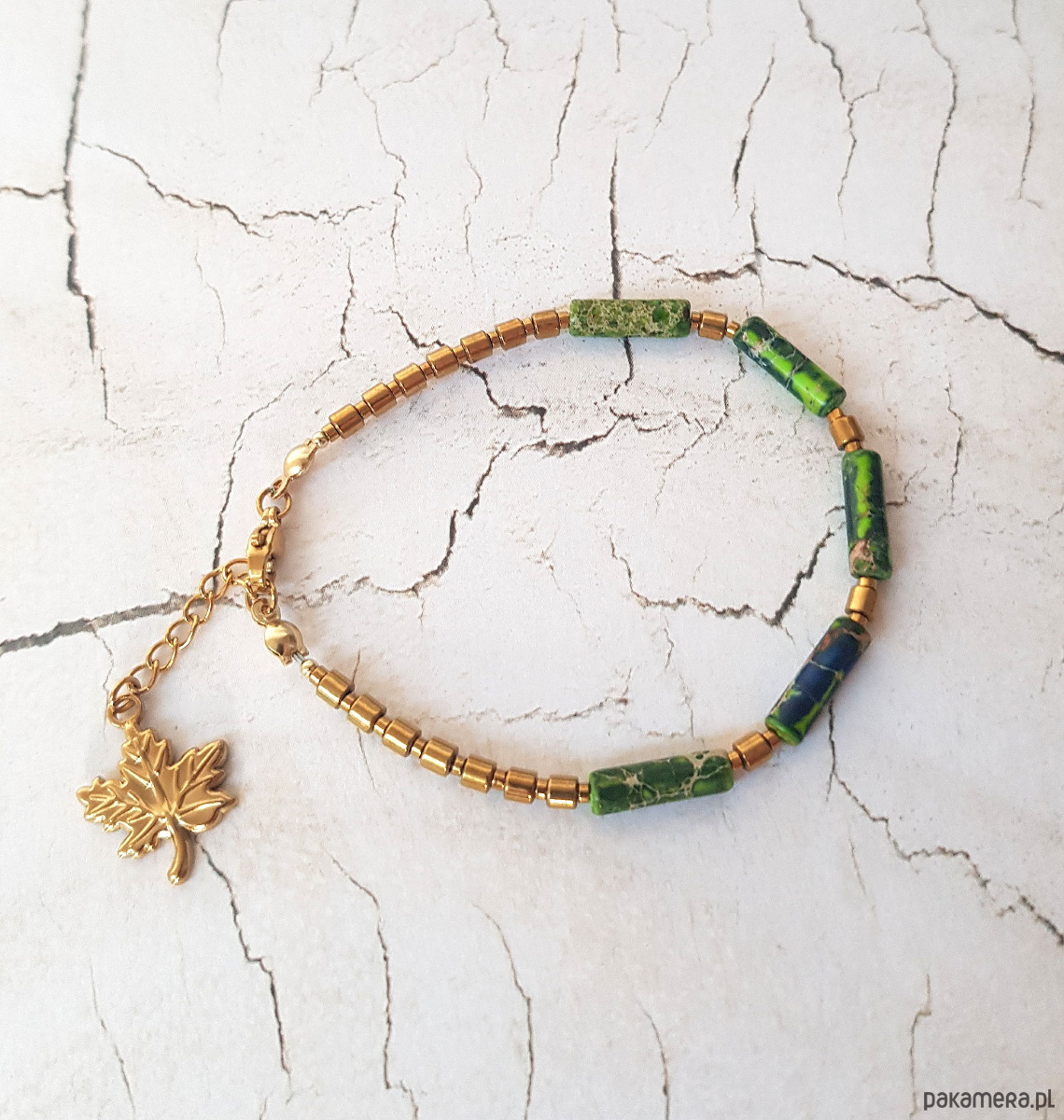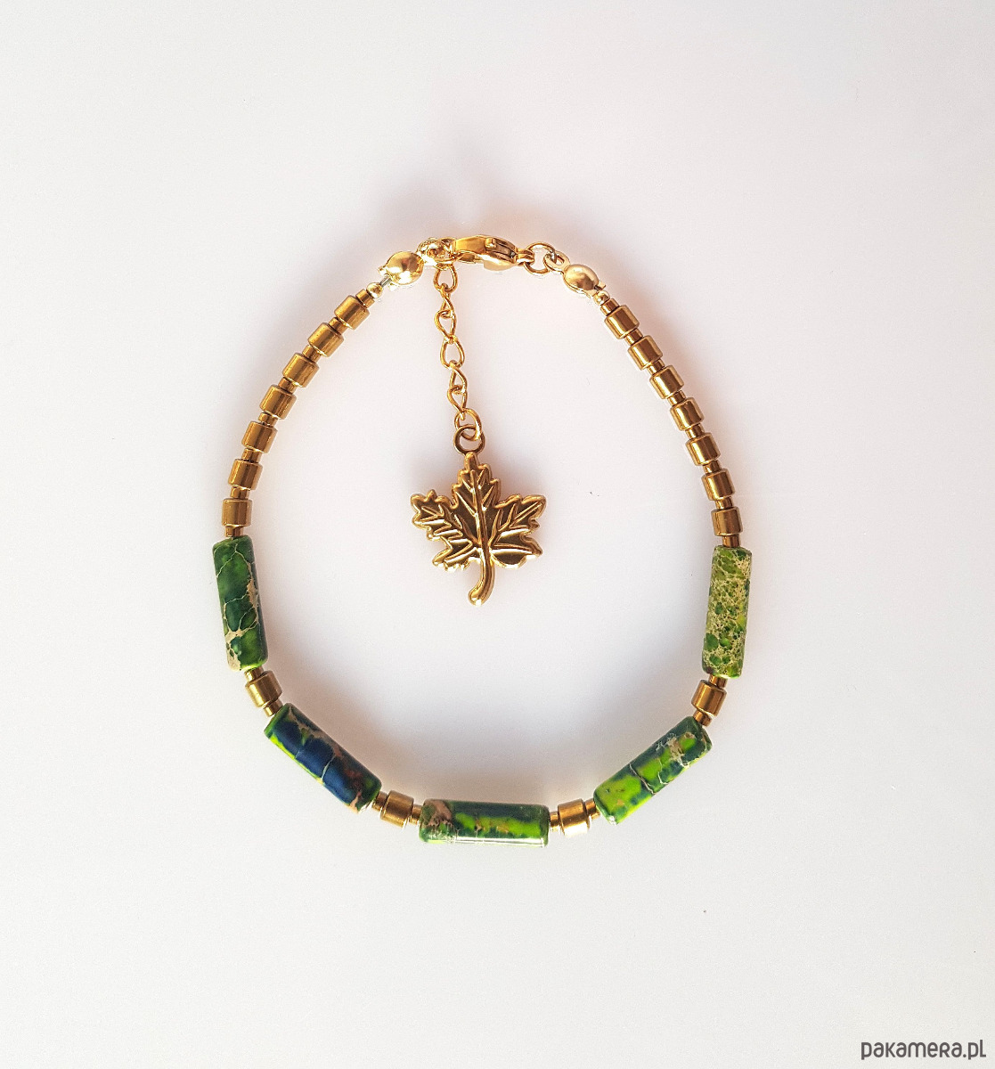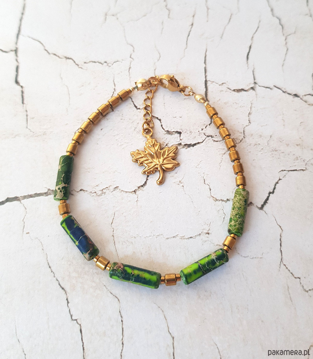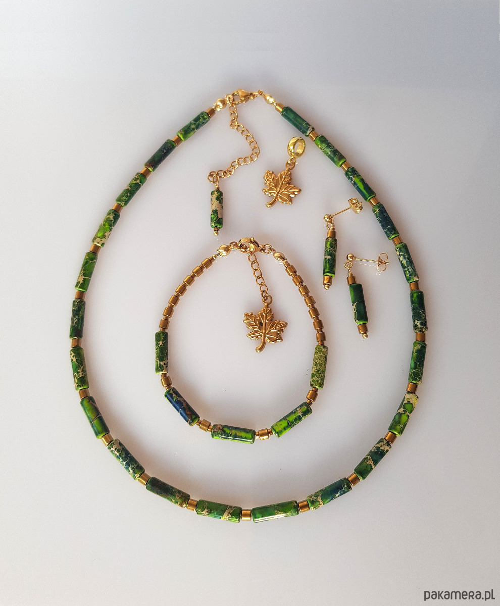 Wykonana z patyczków jaspisu w odcieniach zieleni i złotych wałeczków hematytu.