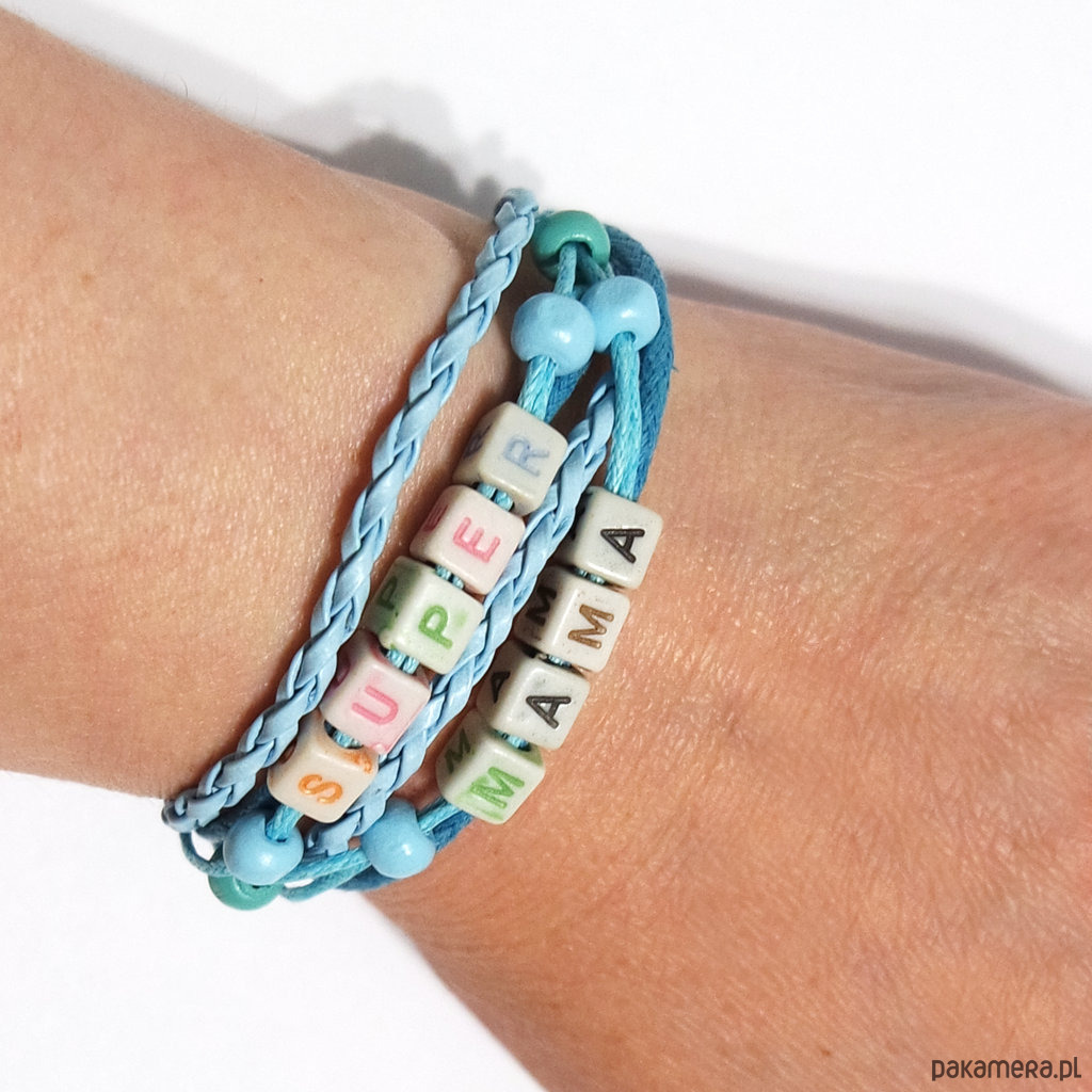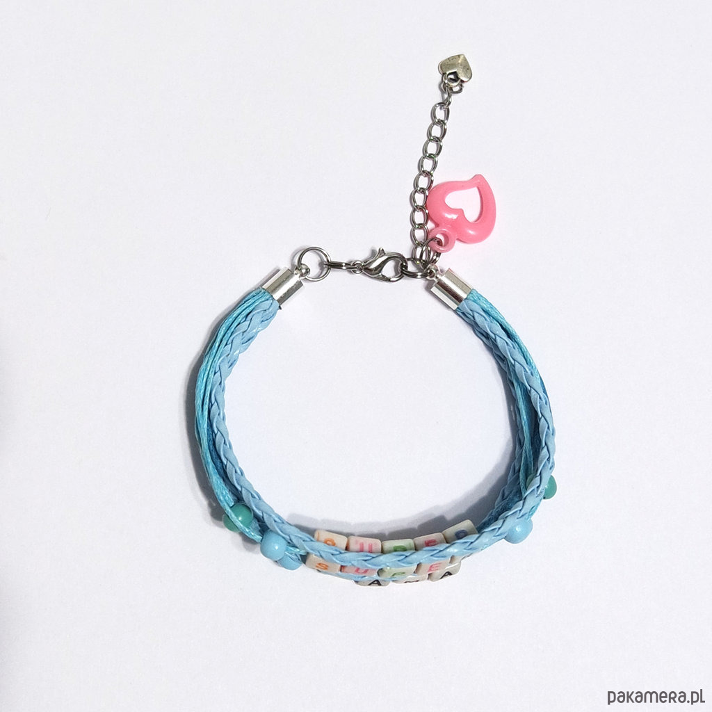 Bransoletka zrobiona jest z rzemieni ze skóry ekologicznej, sznurków oraz przekładek i koralików.