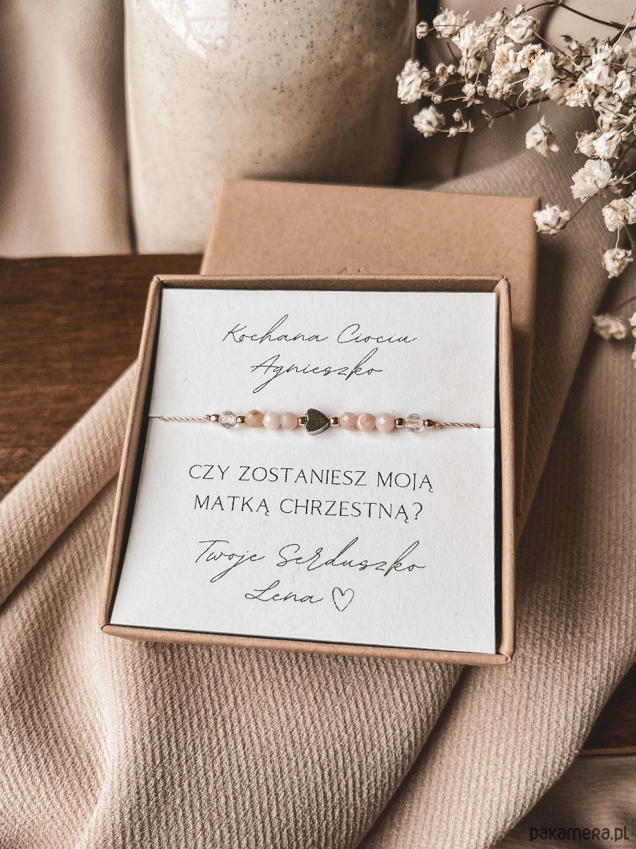 Bransoletka z dedykacją dla Matki Chrzestnej. Serduszko symbolizuje Chrześniaczkę lub Chrześniaka.
