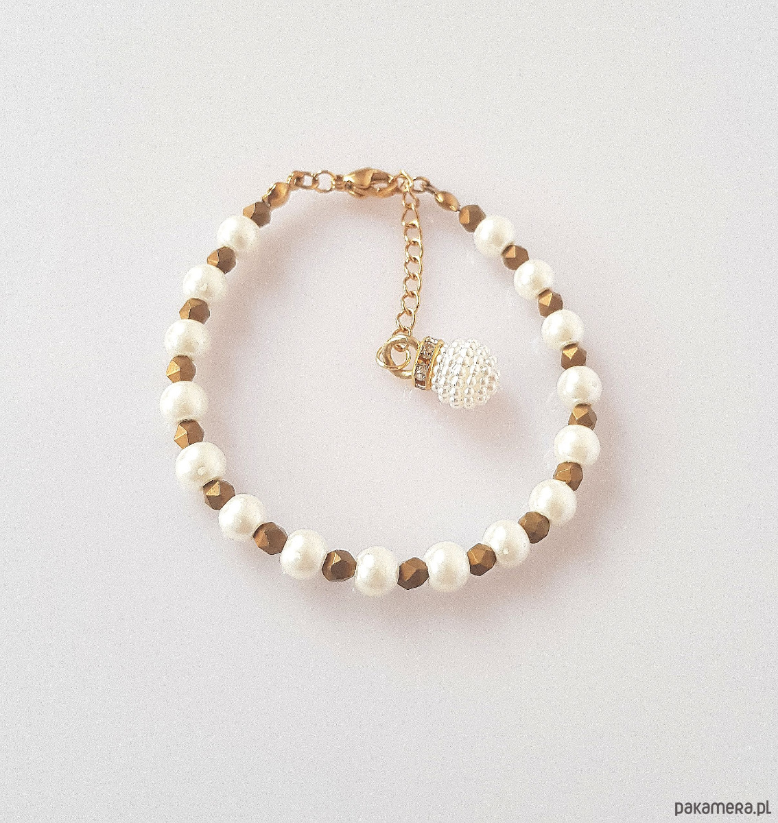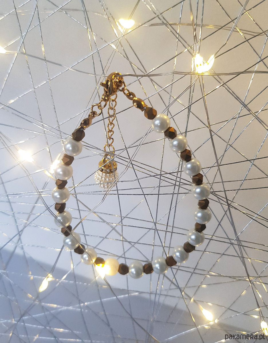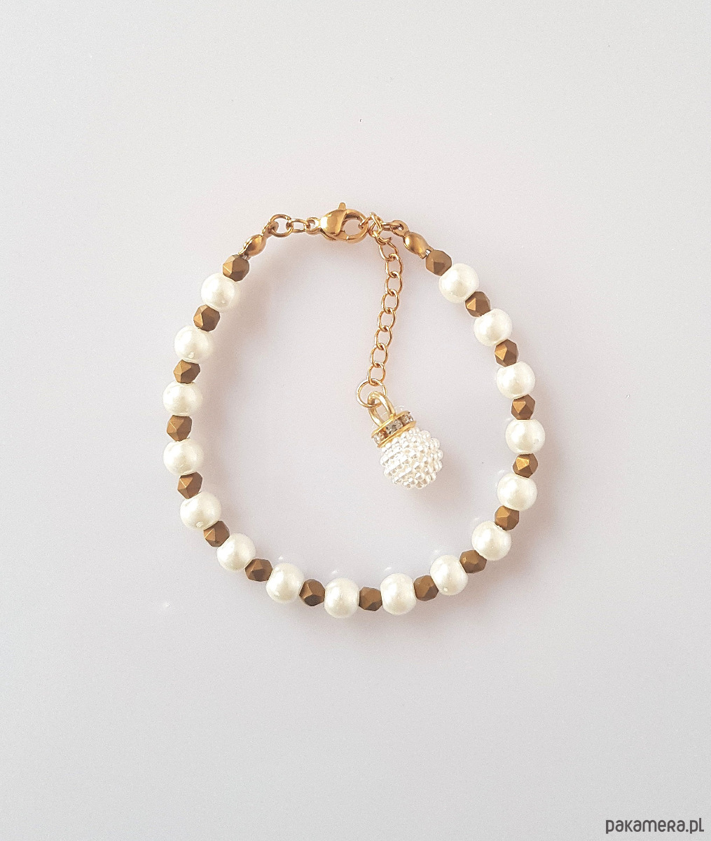 Fasetowane baryłki hematytu w kolorze starego złota i białe perełki muszlowe.