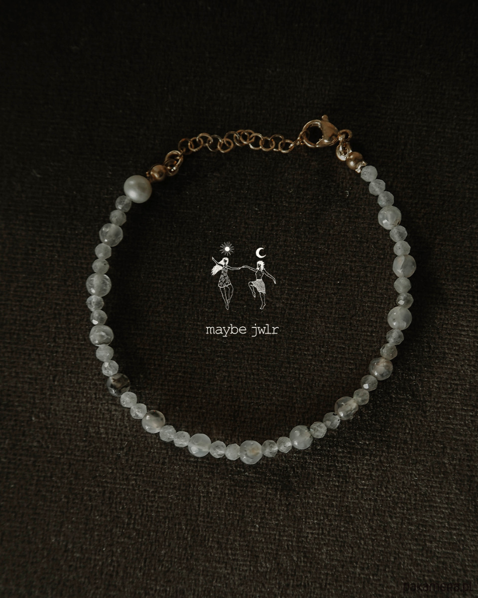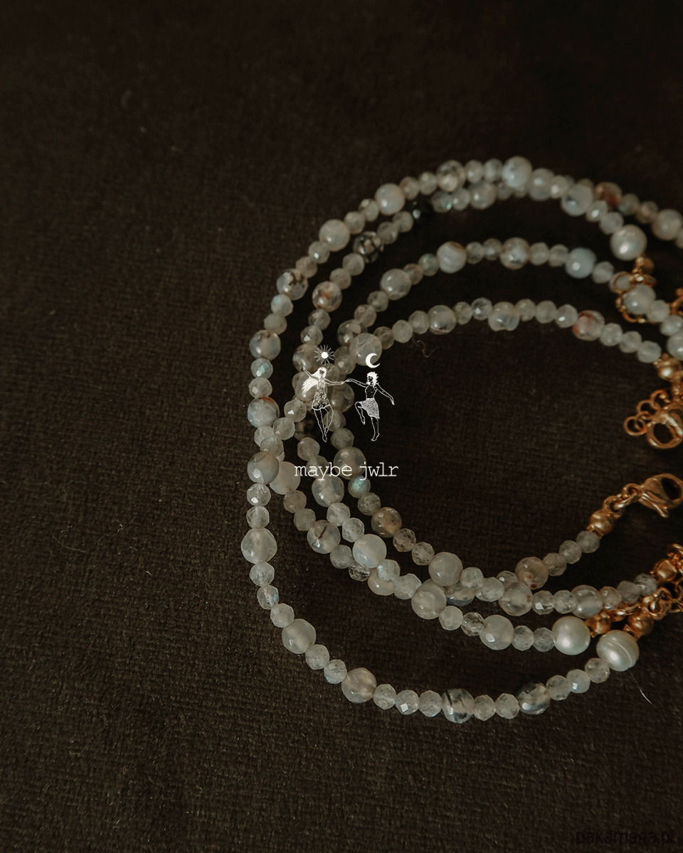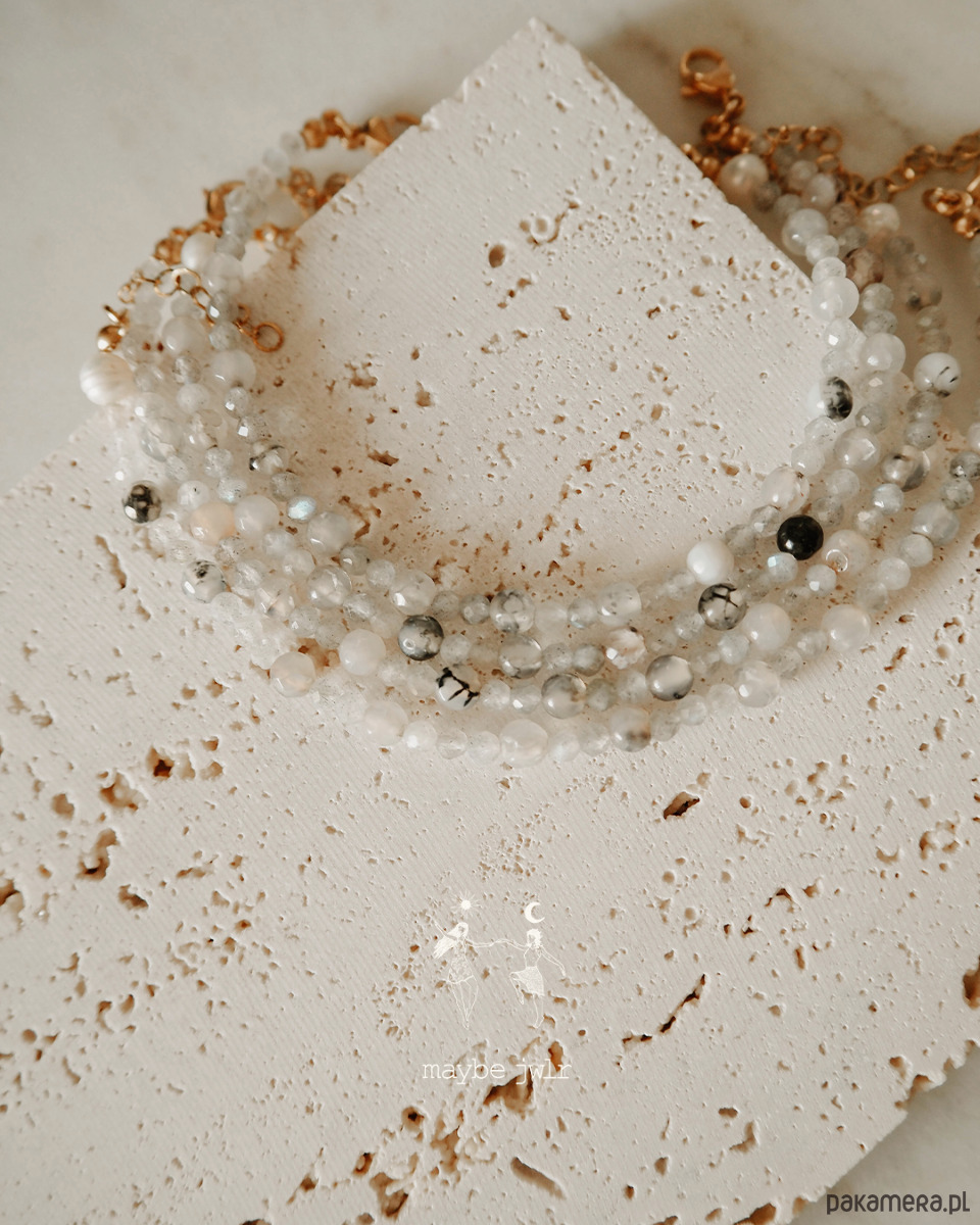 Ta delikatna bransoletka została stworzona z drobnych kamieni labradorytu i szarego agatu o wielkości 3 i 4 mm, które pięknie migoczą niczym zorza na nocnym niebie. Większe, mlecznoszare kamienie z subtelnymi, czarnymi plamkami nadają kompozycji naturalnej głębi i lekkości. Całość dopełnia trwałe zapięcie ze stali szlachetnej oraz wygodna przedłużka.