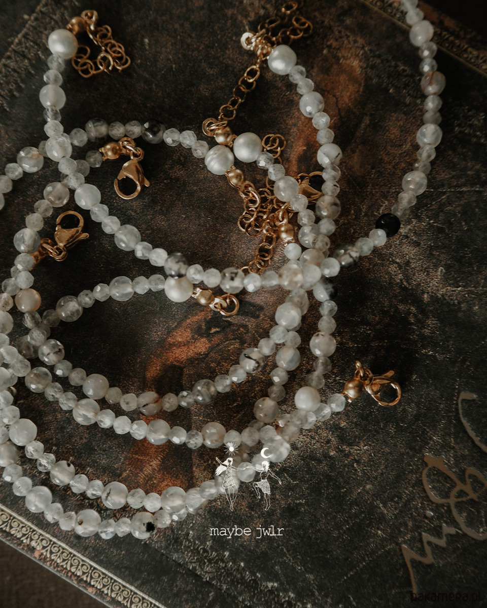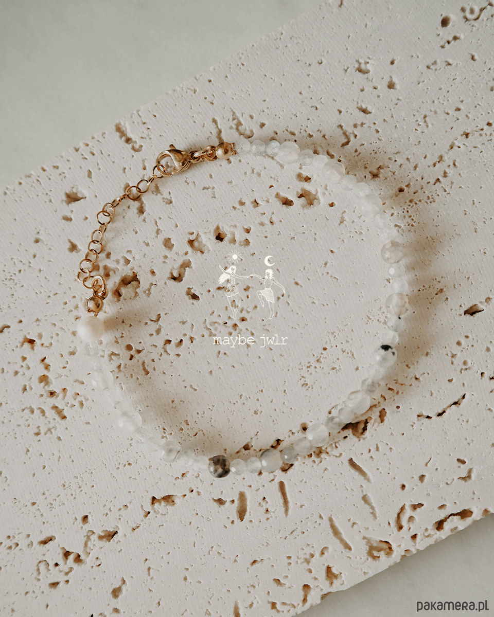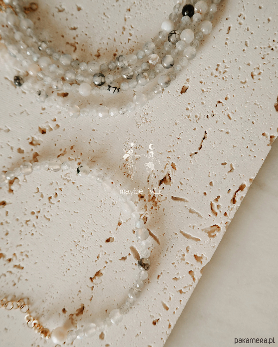 Ta delikatna bransoletka została stworzona z drobnych kamieni labradorytu i szarego agatu o wielkości 3 i 4 mm, które pięknie migoczą niczym zorza na nocnym niebie. Większe, mlecznoszare kamienie z subtelnymi, czarnymi plamkami nadają kompozycji naturalnej głębi i lekkości. Całość dopełnia trwałe zapięcie ze stali szlachetnej oraz wygodna przedłużka.