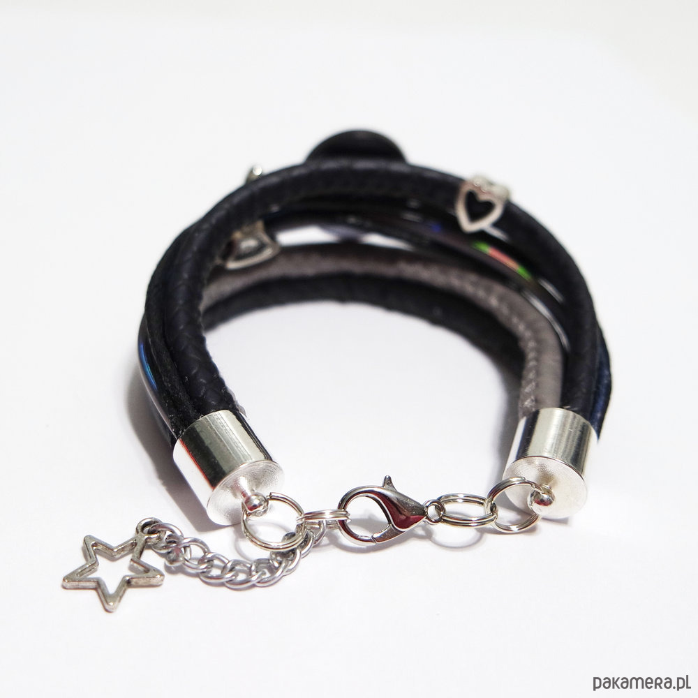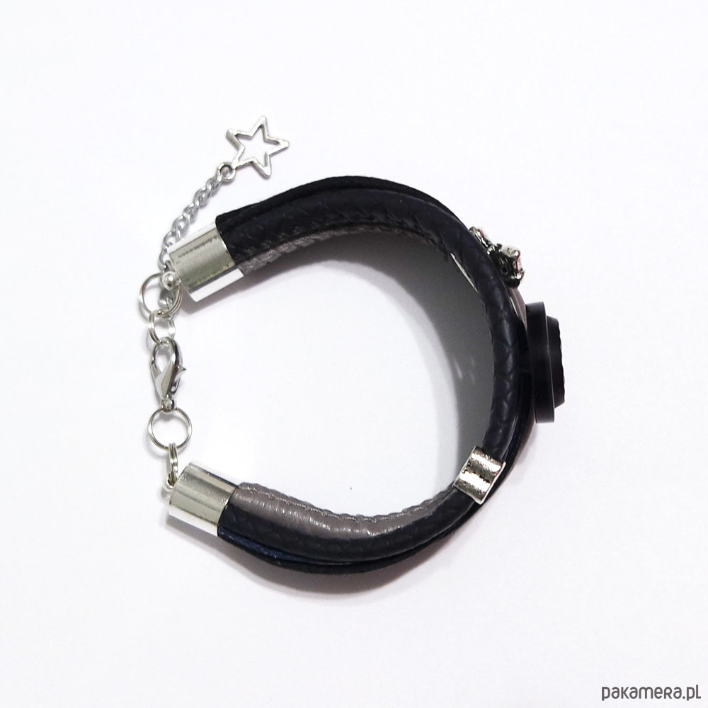 Bransoletka zrobiona jest z rzemieni z eko-skóry, sznurka oraz przekładek i ozdobnego guzika.