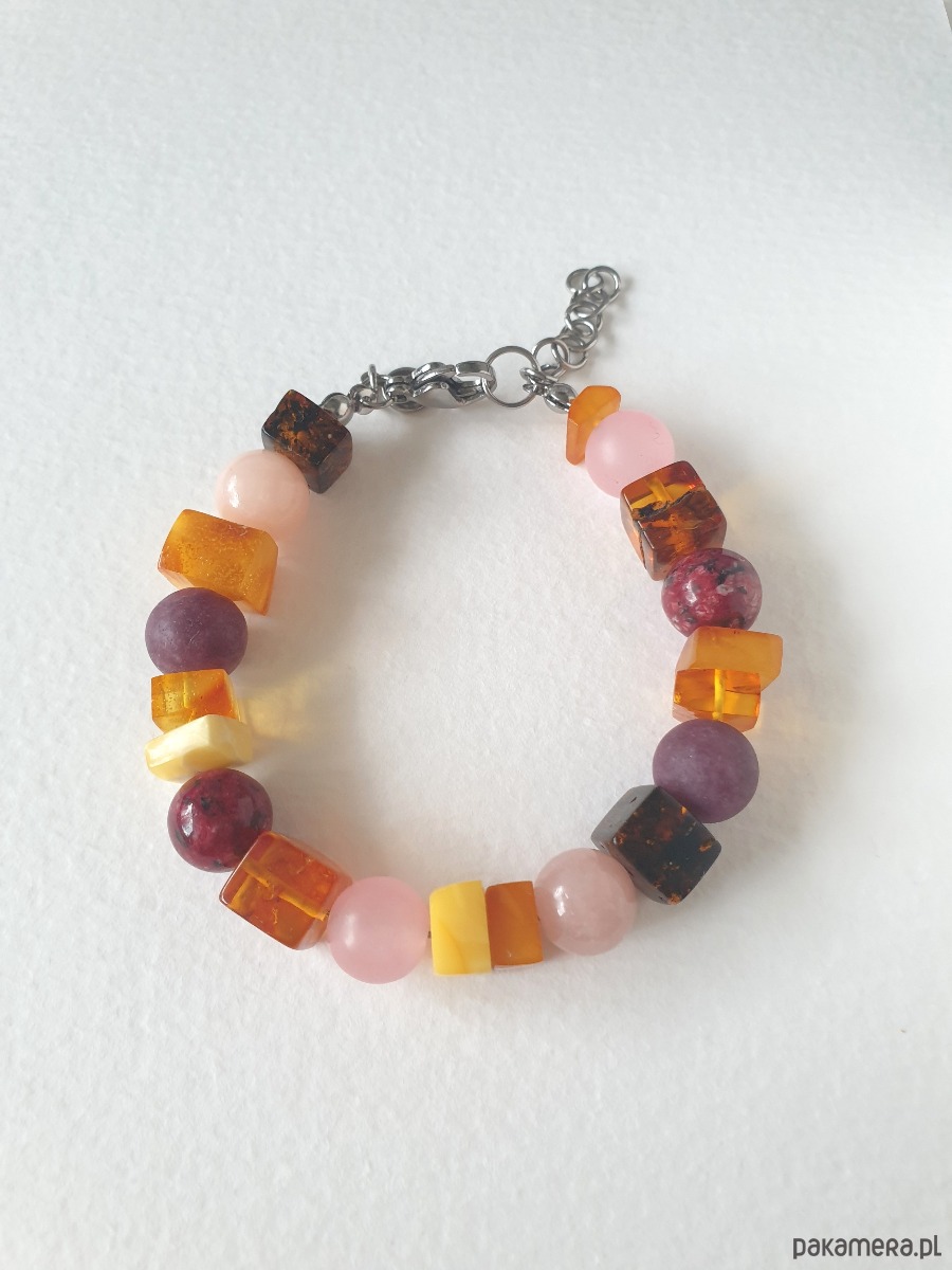 Bransoletka SZASZŁYK bursztyn, jadeit, bordo róż