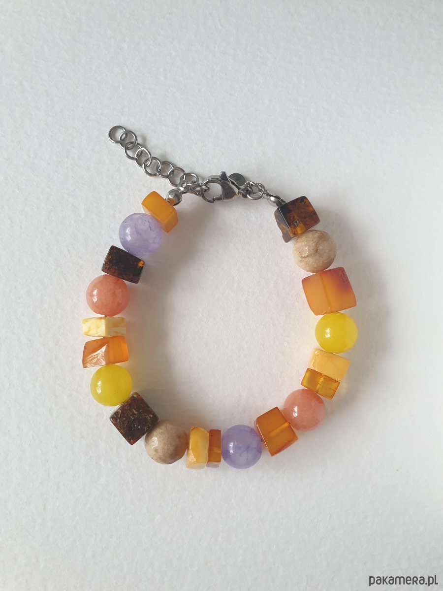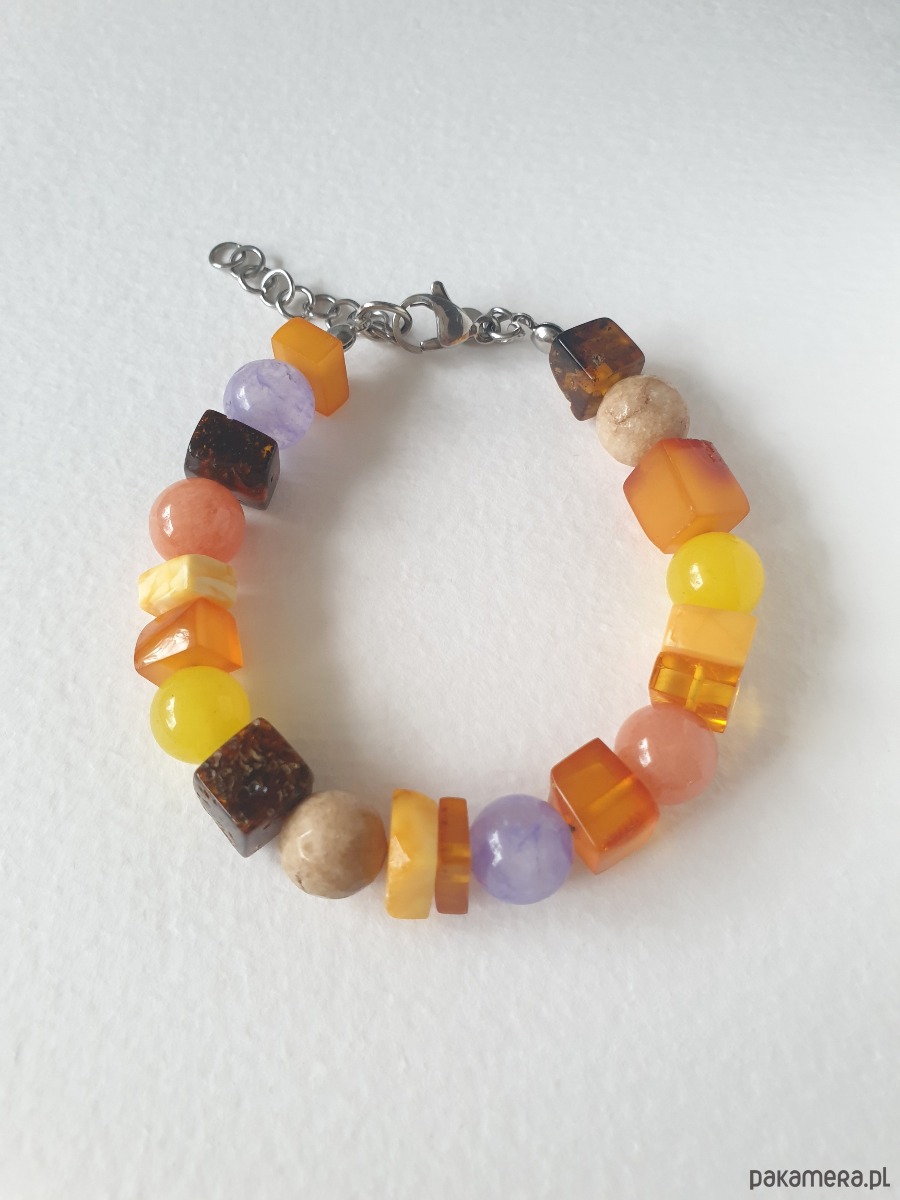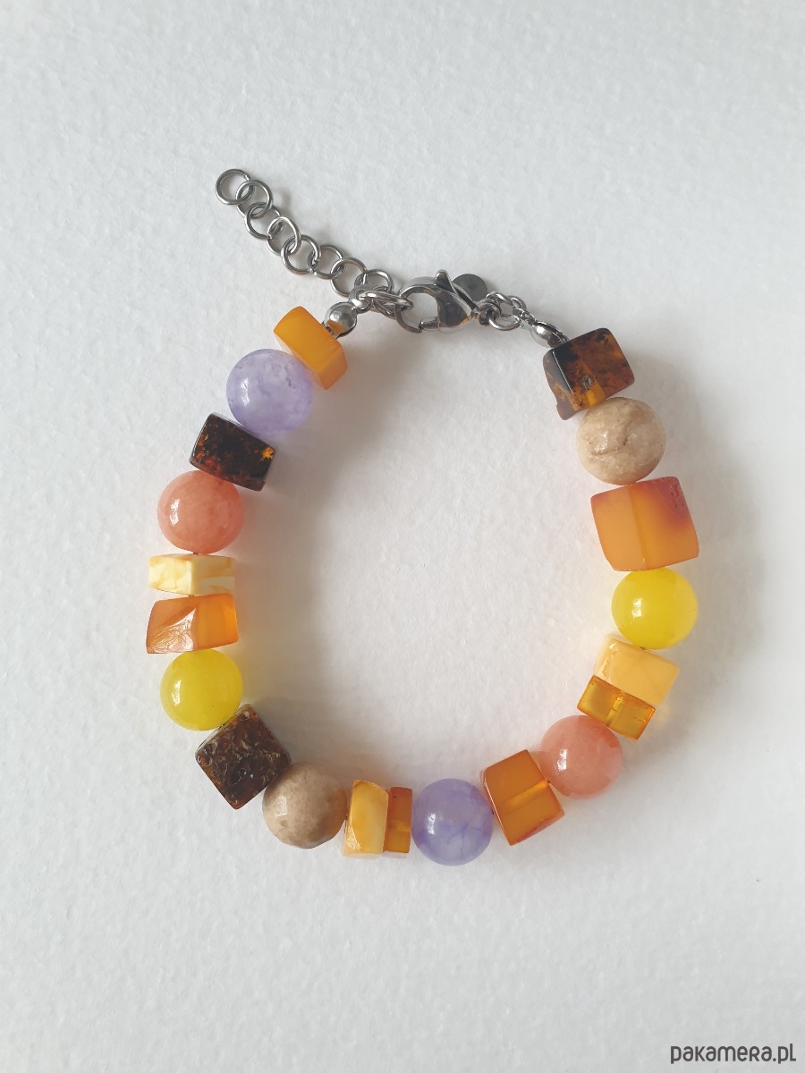 Duża i okazała bransoletka z kolekcji SZASZŁYKI. Tworzona ręcznie z kamieni naturalnych. W tym - bursztyn ręcznie szlifowany, kulki jadeit barwiony. Zapięcie stal szlachetna. Pojedyncze egzemplarze.