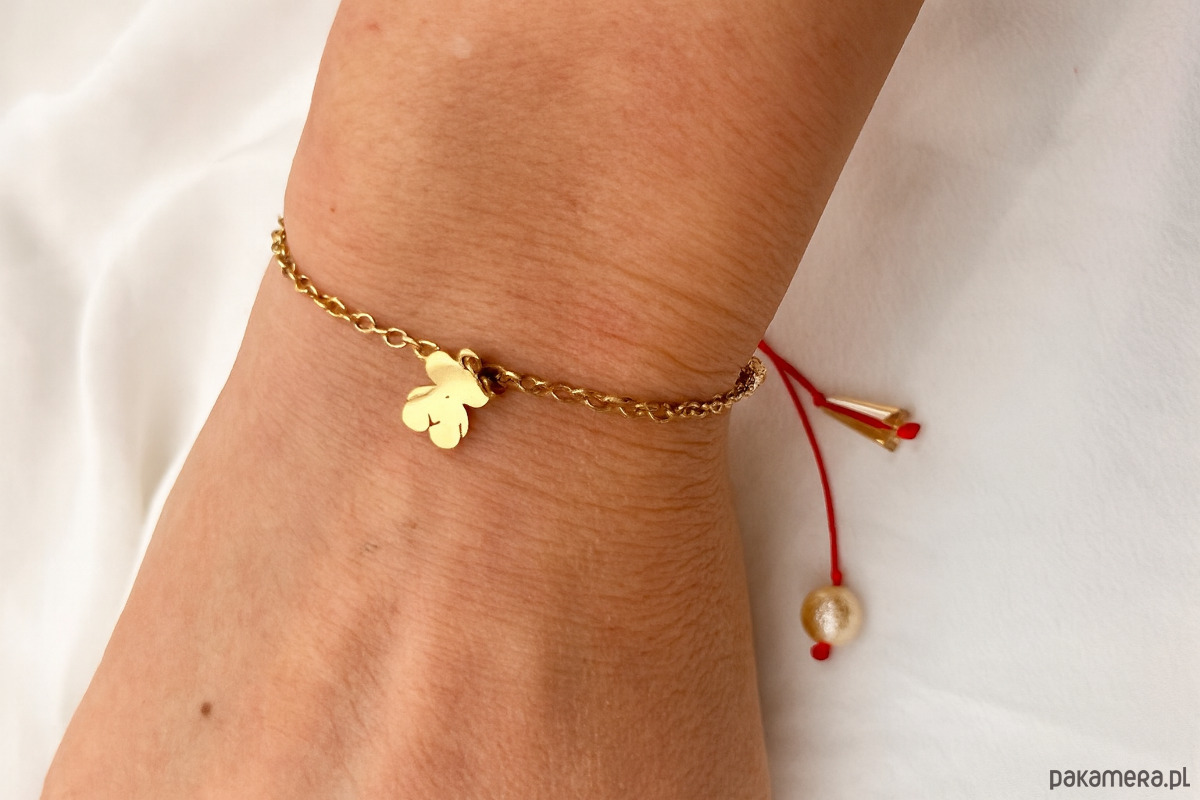Centralnym elementem jest zawieszka w kształcie misia – minimalistyczny, gładki, pozłacany, pięknie odbija światło i dodaje uroku każdej stylizacji.