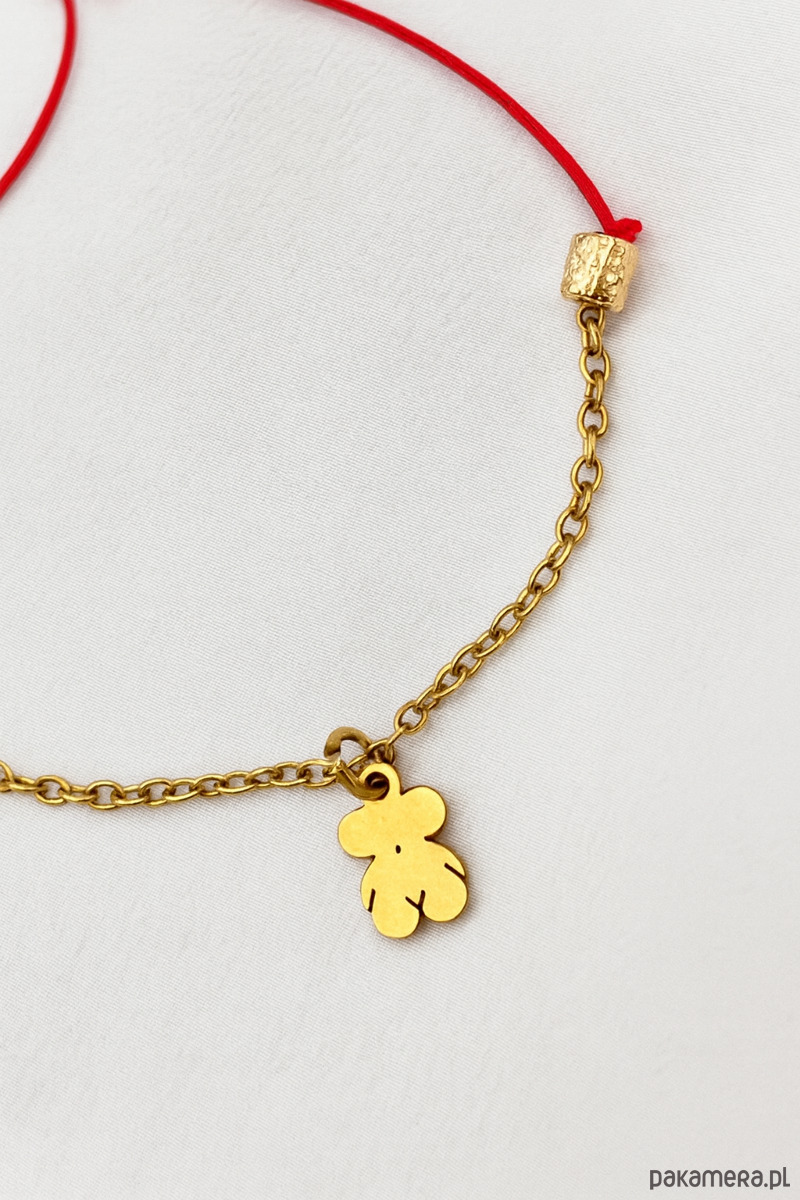 Bransoletka na czerwonym sznurku z pozłacanym misiem.