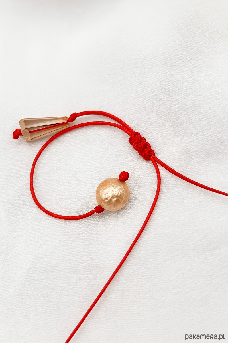 Bransoletka ma regulowane zapięcie na mocnym, czerwonym sznurku zakończonym dekoracyjnymi, teksturowanymi perła i kryształkiem Swarovski. Jest lekka, wygodna i idealna do noszenia na co dzień – samodzielnie lub w zestawie z innymi bransoletkami.