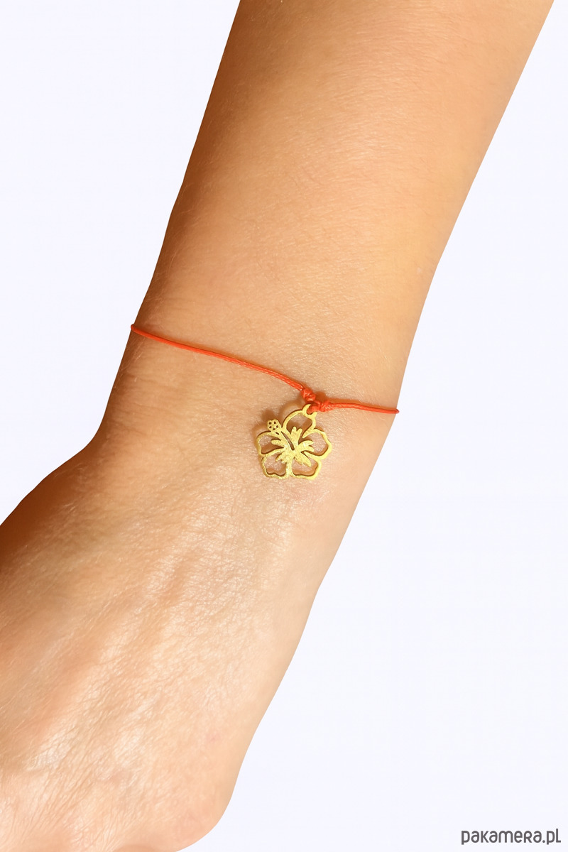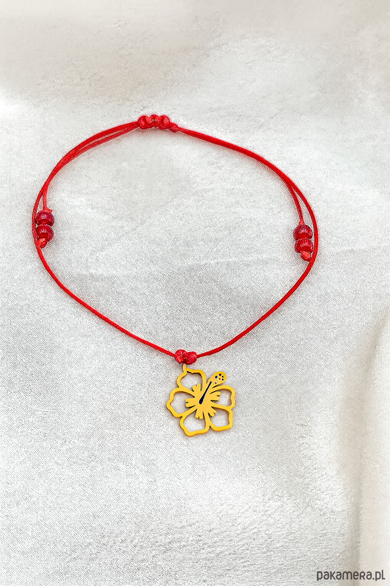Bransoletka szczęścia na czerwonym, regulowanym sznurku z delikatnymi szklanymi koralikami po bokach. W centrum zawieszka ze stali szlachetnej złoconej w kształcie kwiatu hibiskusa – symbolu radości, energii i kobiecości.