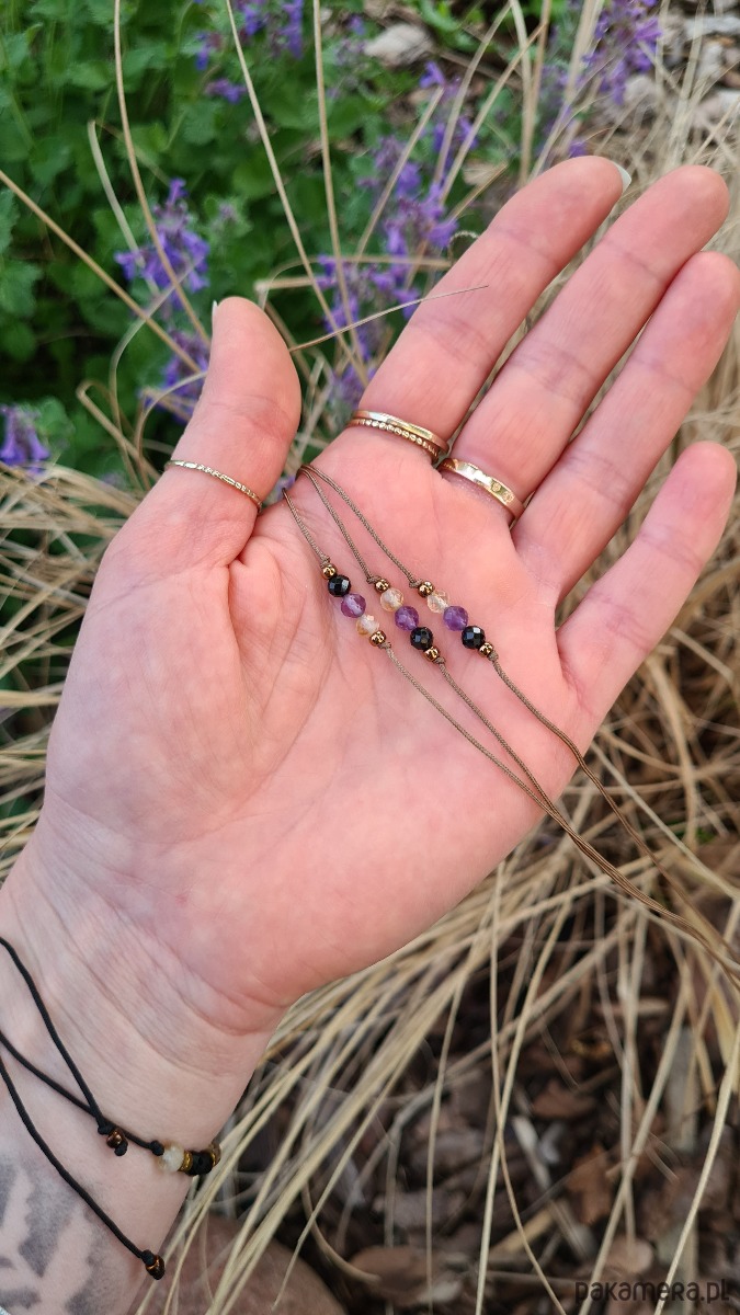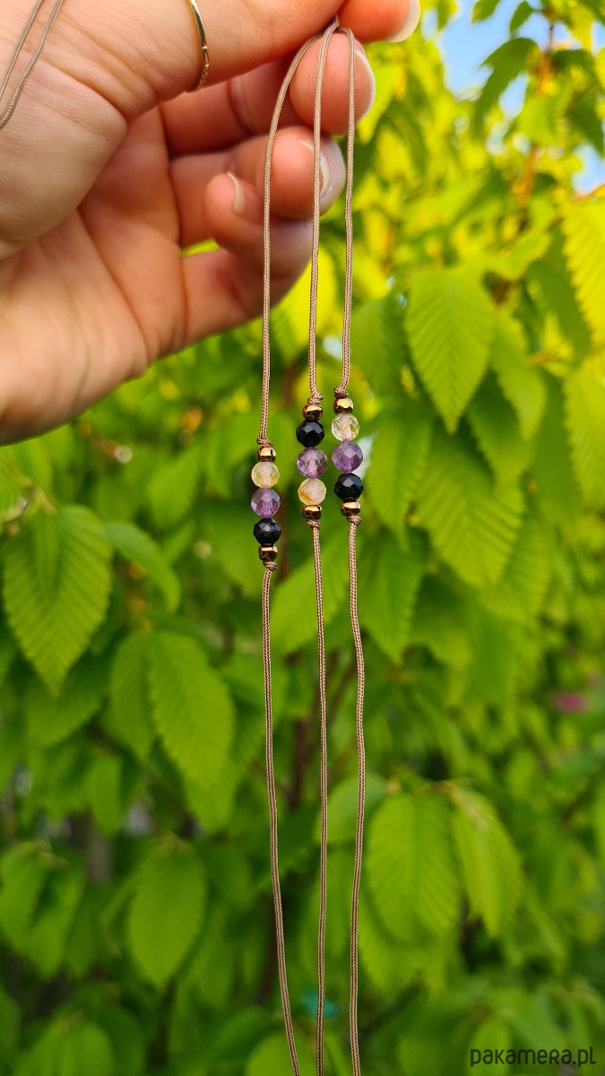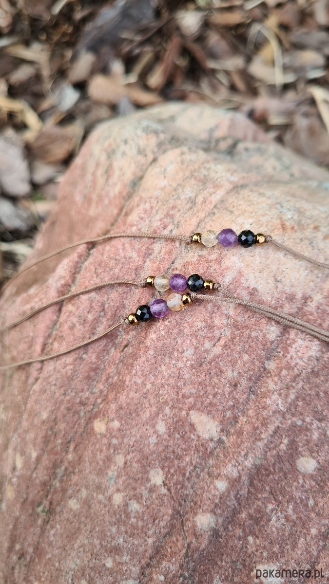 Minimalistyczna bransoletka na szczęście, wykonana z kamieni naturalnych (kuleczki fasetowane 4mm): ametystu, cytrynu oraz czarnego turmalinu, którym przypisuje się wspierającą moc. Idealna dla Pań lubiących naturalne dodatki, amulety i ciekawy minimalizm.