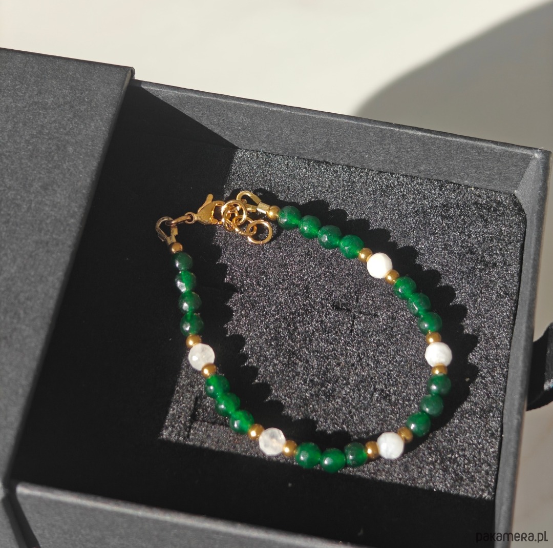 Bransoletka wykonana z połączenia szmaragdu i kamienia księżycowego — subtelnego, eleganckiego duetu o delikatnym, naturalnym blasku. Długość bransoletki to 16 cm + 1,5 cm przedłużki, dzięki czemu wygodnie dopasowuje się do nadgarstka.