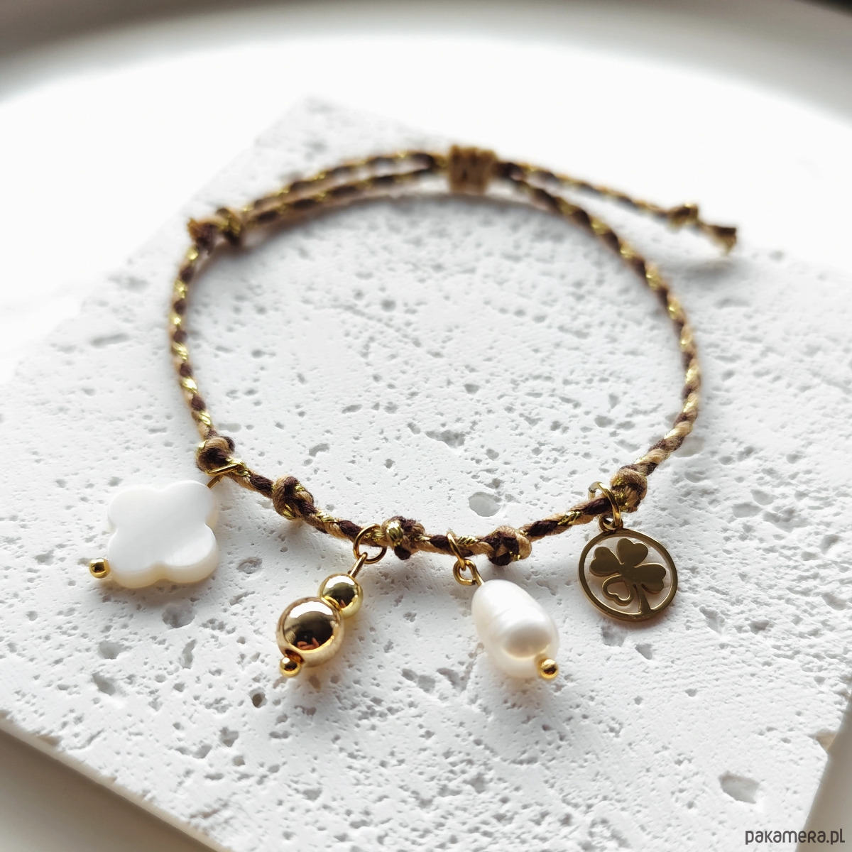 Bransoletka regulowana na sznurku plecionym. Zapięcie makramowe. Zawieszki stal chirurgiczna i masa perłowa.