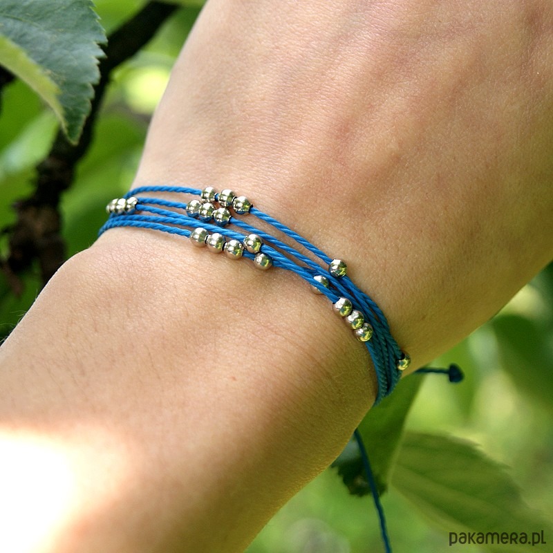Ręcznie robiona bransoletka sznurkowa z metalowymi koralikami w kolorze srebrnym.