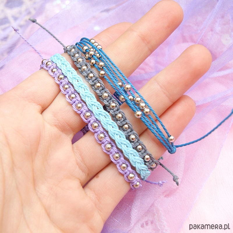 Ręcznie robiona bransoletka sznurkowa z metalowymi koralikami w kolorze srebrnym.