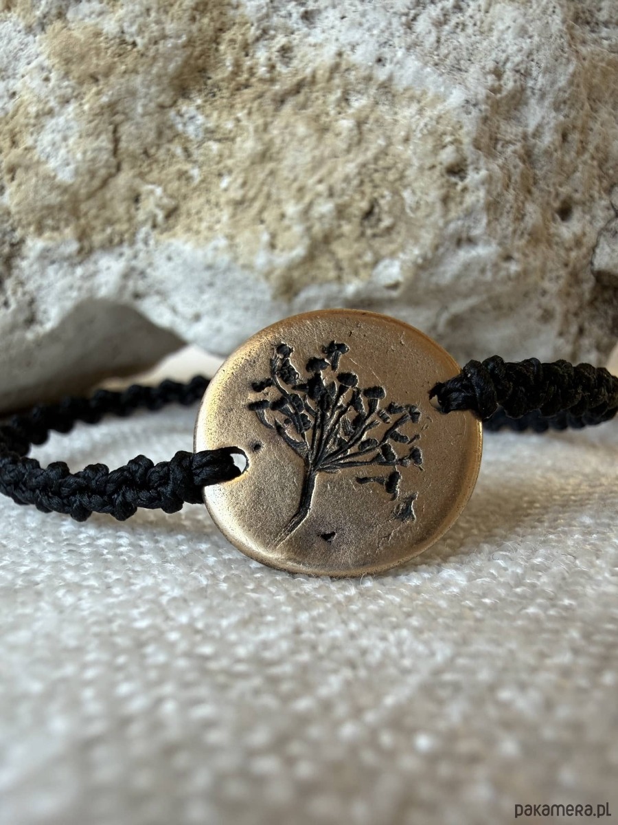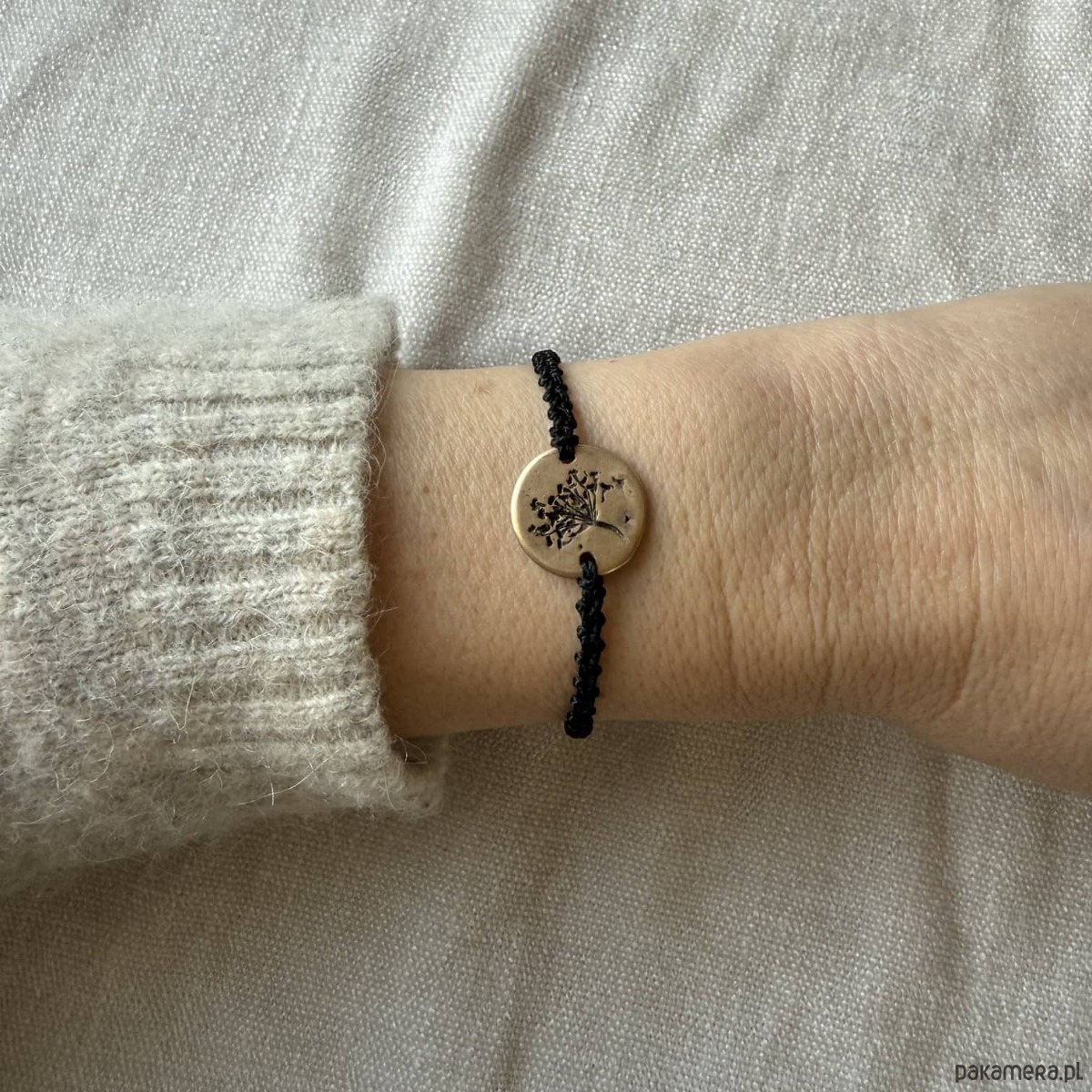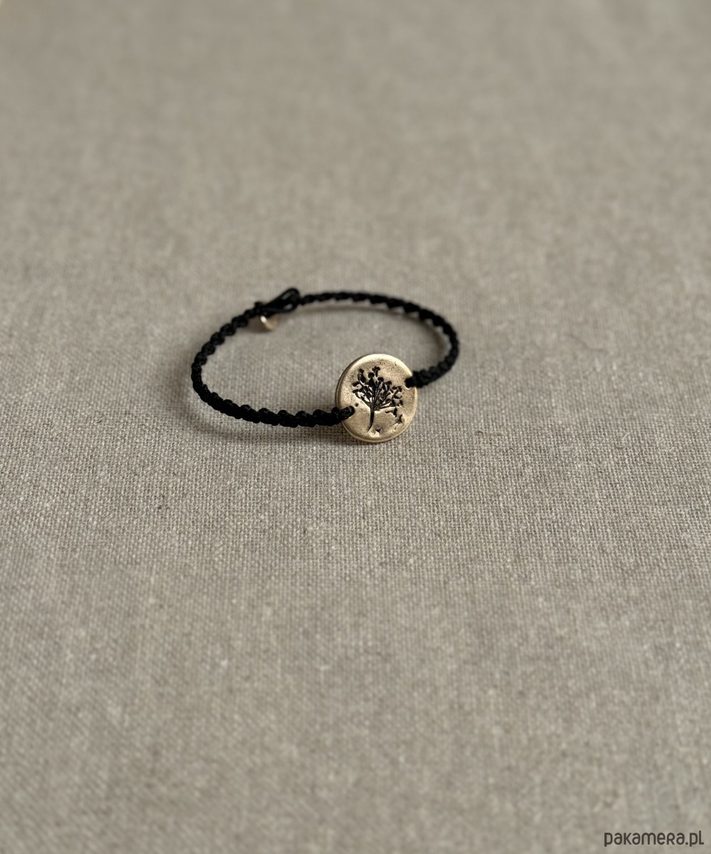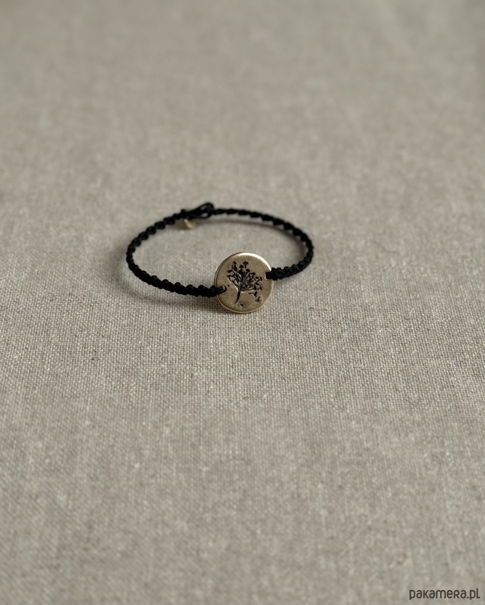 Ręcznie wykonana bransoletka z centralnym detalem z brązu, w którym utrwalony jest odcisk prawdziwej rośliny. Powstała w jednym egzemplarzu - odcisk rośliny, który widzisz, nie powtórzy się w innej sztuce.