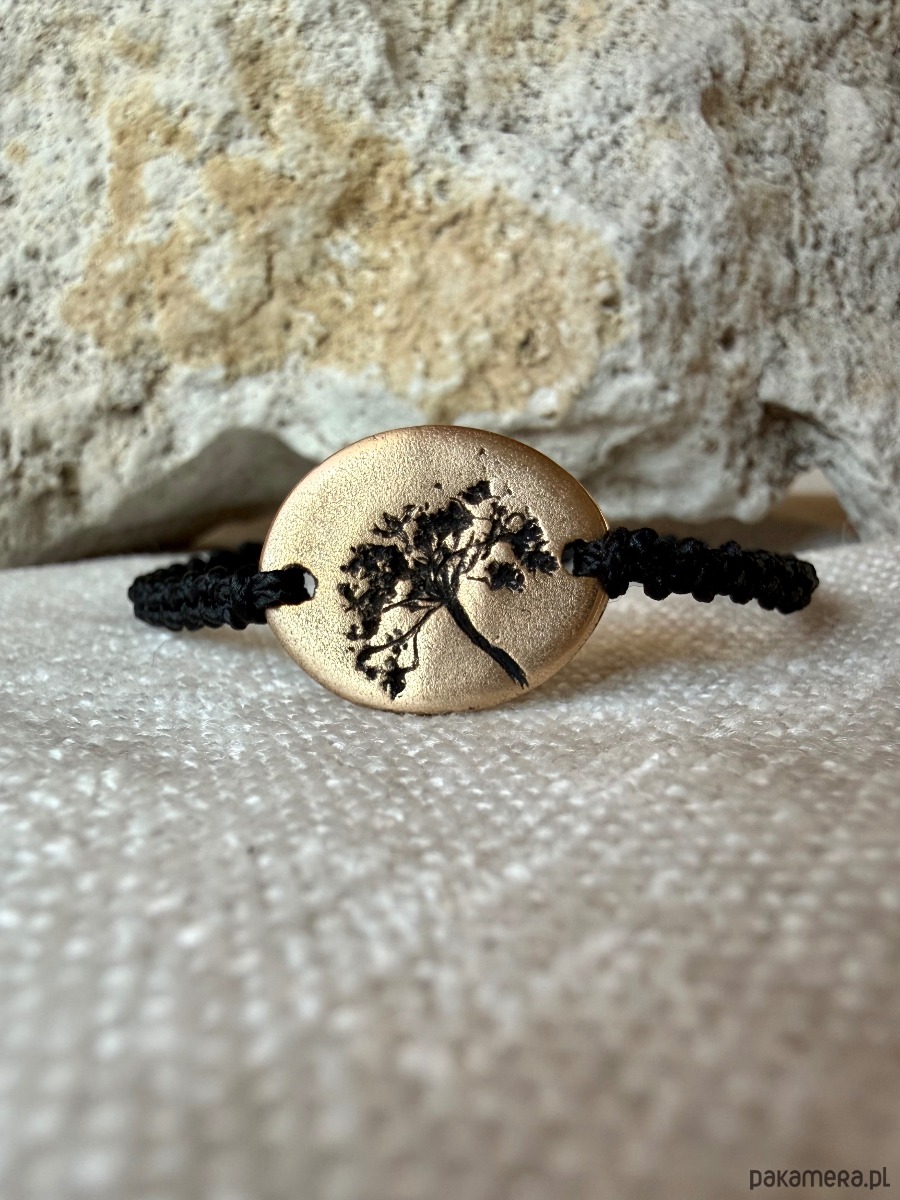 Ręcznie wykonana bransoletka z centralnym detalem z brązu, w którym utrwalony jest odcisk prawdziwej rośliny. Powstała w jednym egzemplarzu - odcisk rośliny, który widzisz, nie powtórzy się w innej sztuce.