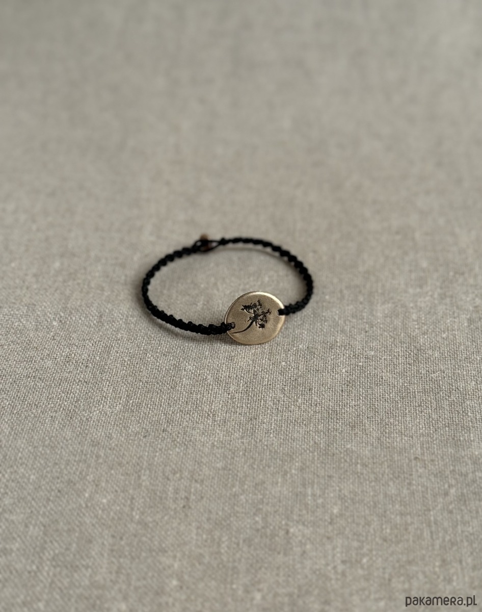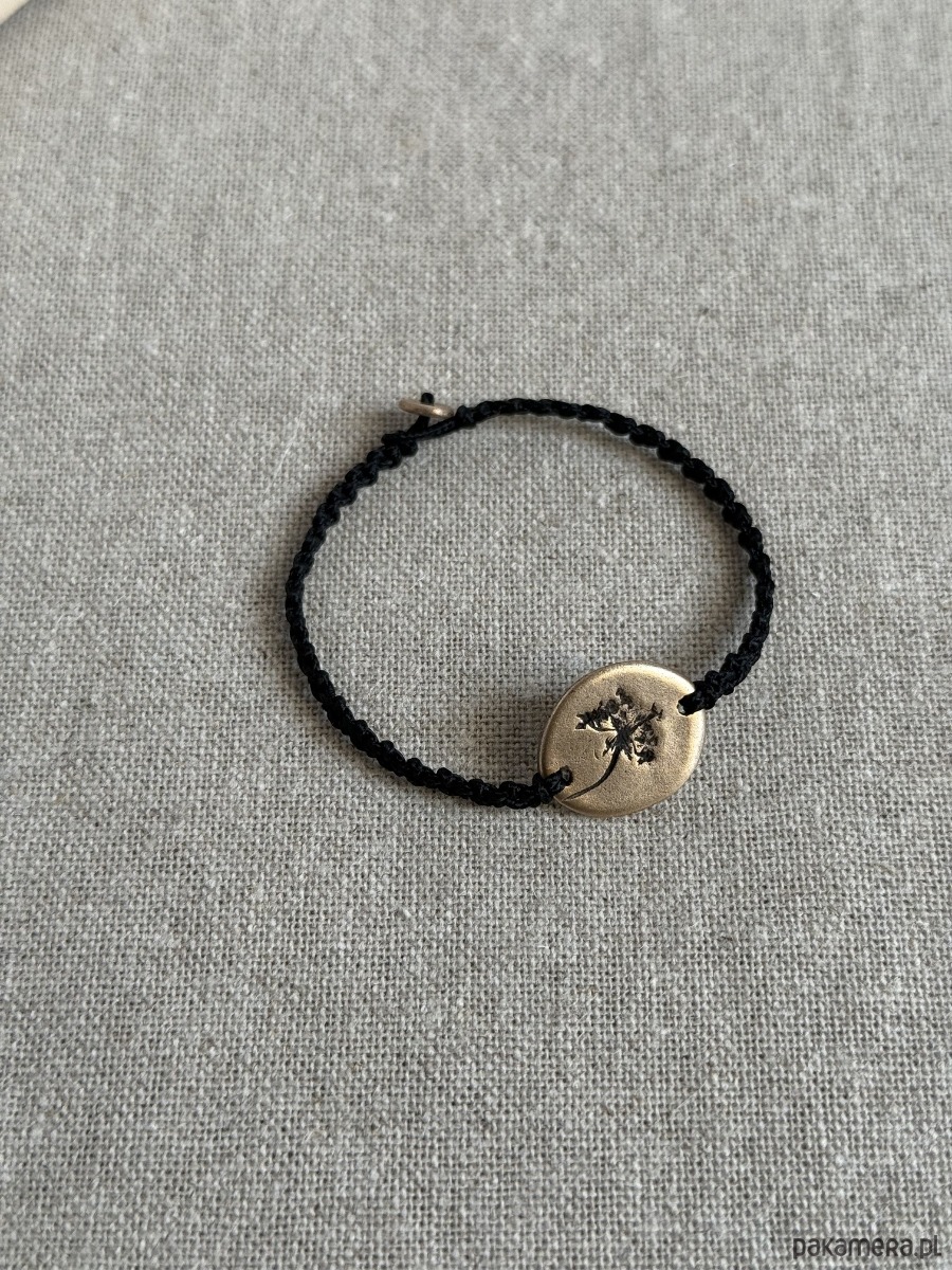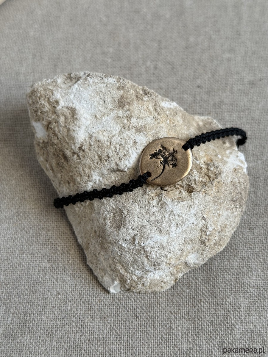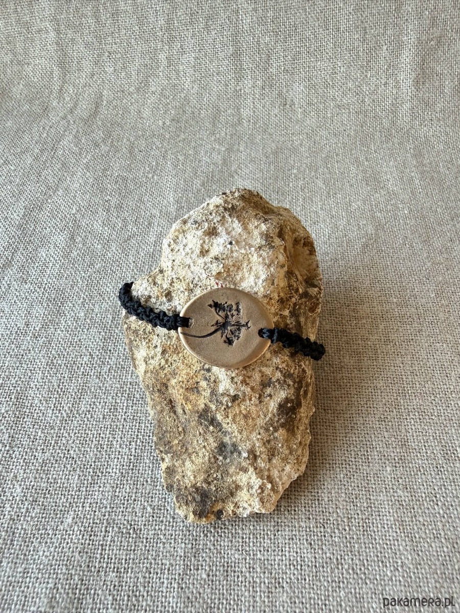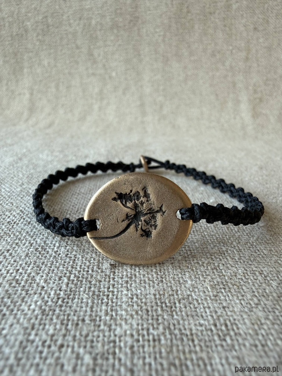 Ręcznie wykonana bransoletka z centralnym detalem z brązu, w którym utrwalony jest odcisk prawdziwej rośliny. Powstała w jednym egzemplarzu - odcisk rośliny, który widzisz, nie powtórzy się w innej sztuce.
