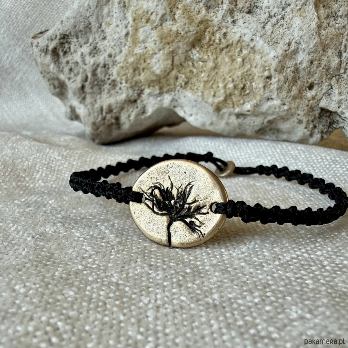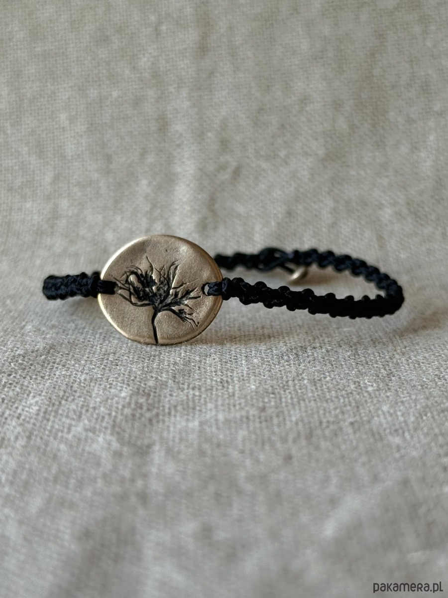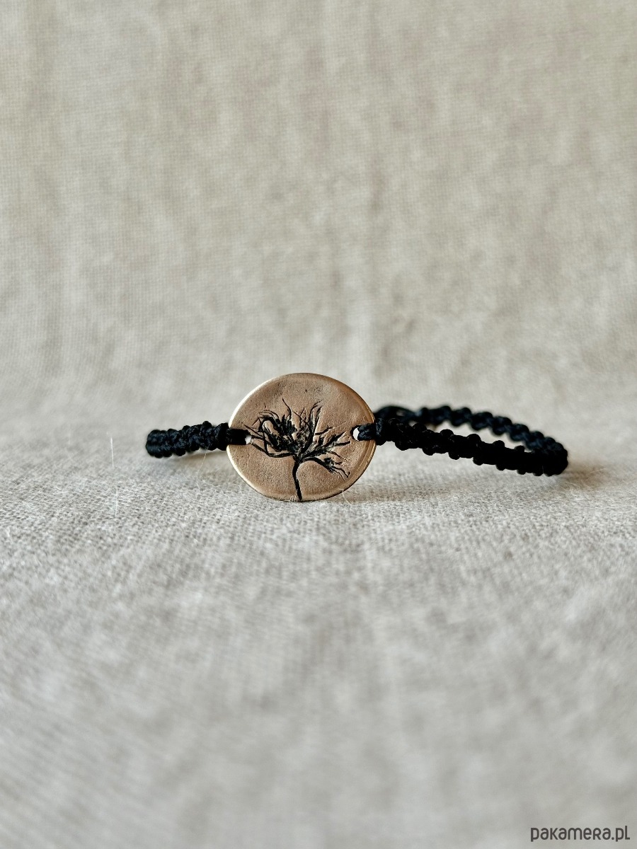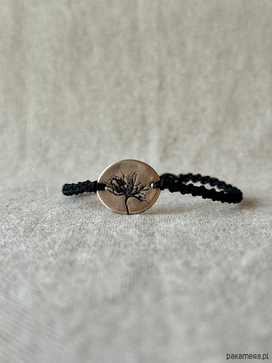 Ręcznie wykonana bransoletka z centralnym detalem z brązu, w którym utrwalony jest odcisk prawdziwej rośliny. Powstała w jednym egzemplarzu - odcisk rośliny, który widzisz, nie powtórzy się w innej sztuce.