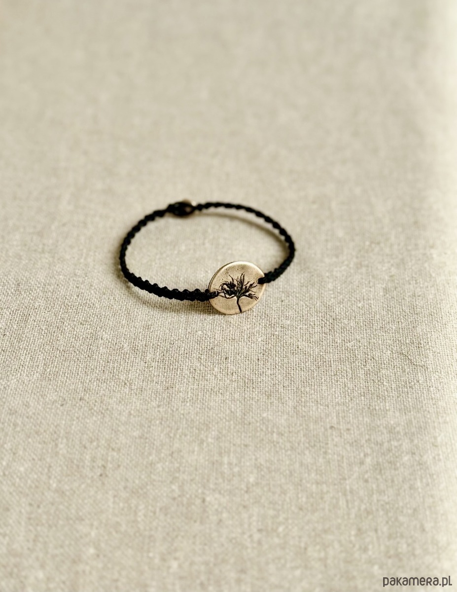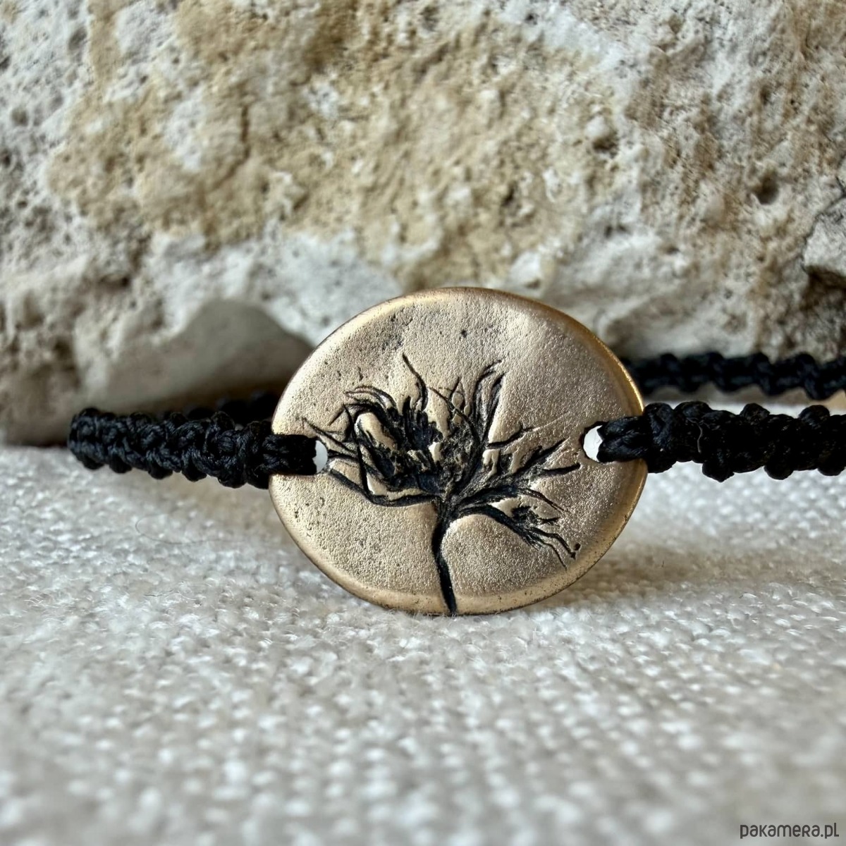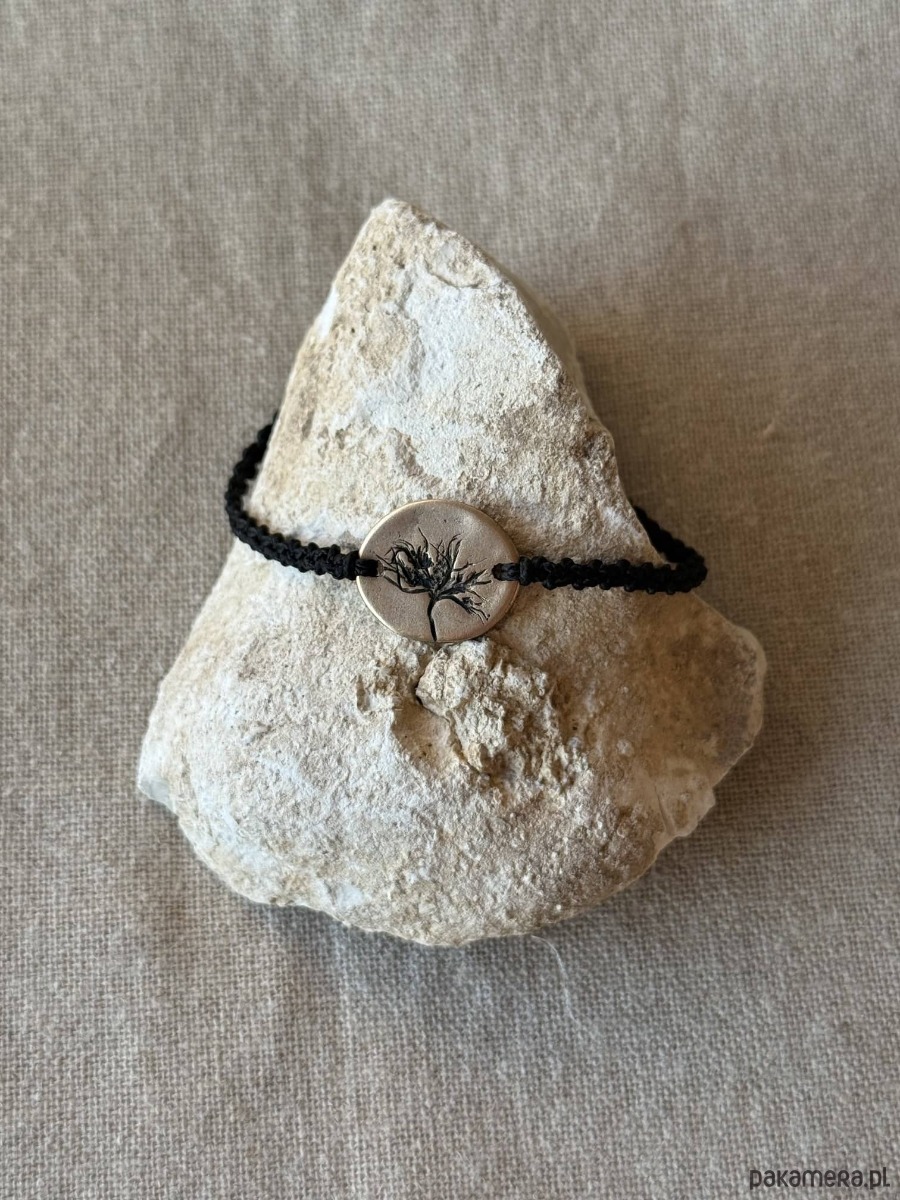 Ręcznie wykonana bransoletka z centralnym detalem z brązu, w którym utrwalony jest odcisk prawdziwej rośliny. Powstała w jednym egzemplarzu - odcisk rośliny, który widzisz, nie powtórzy się w innej sztuce.