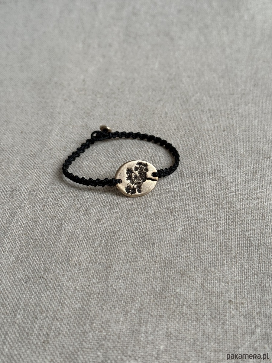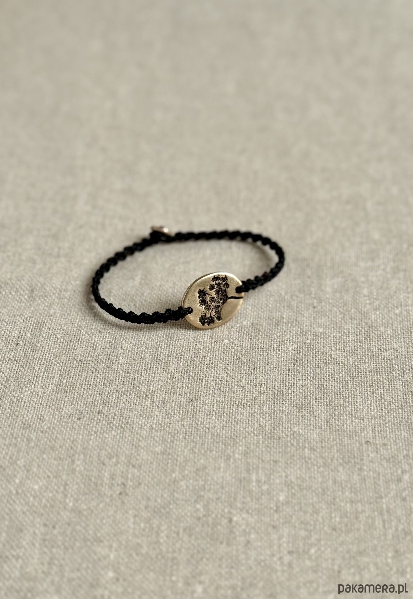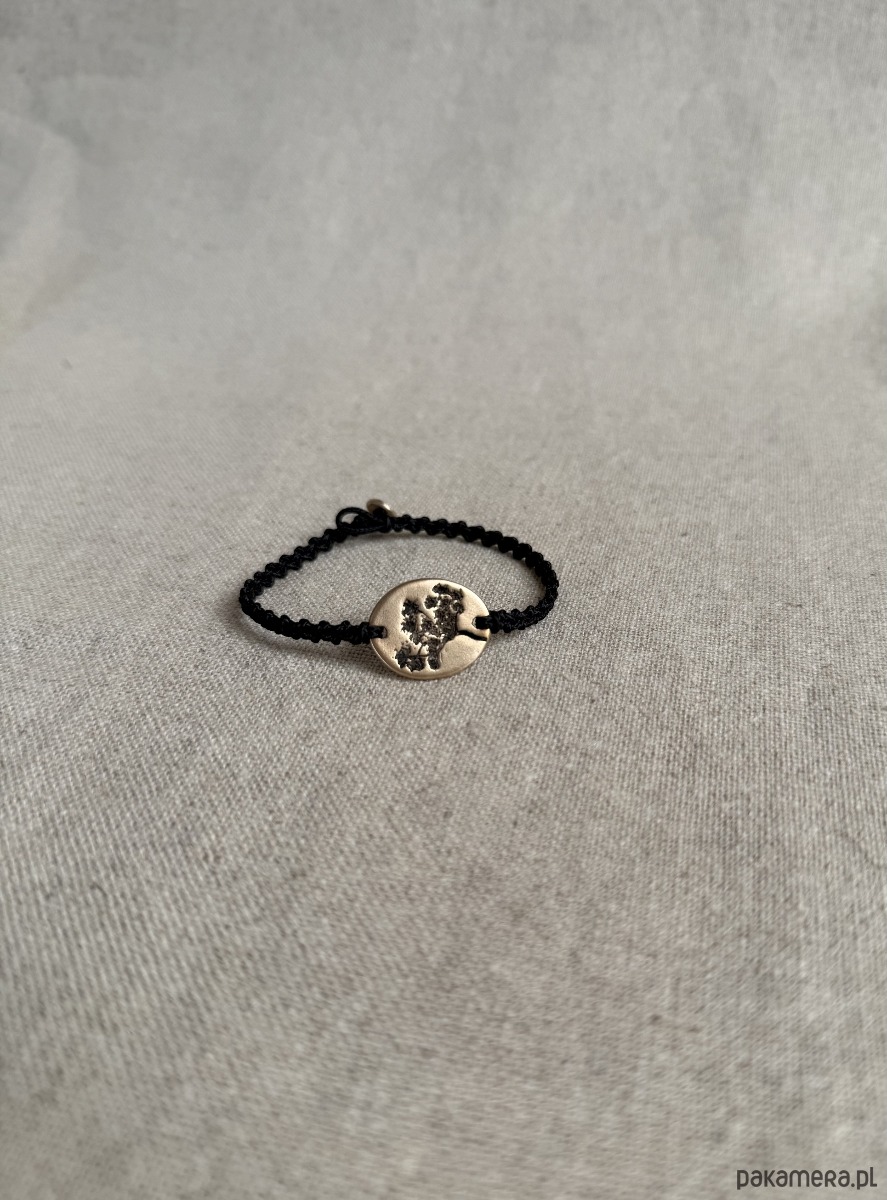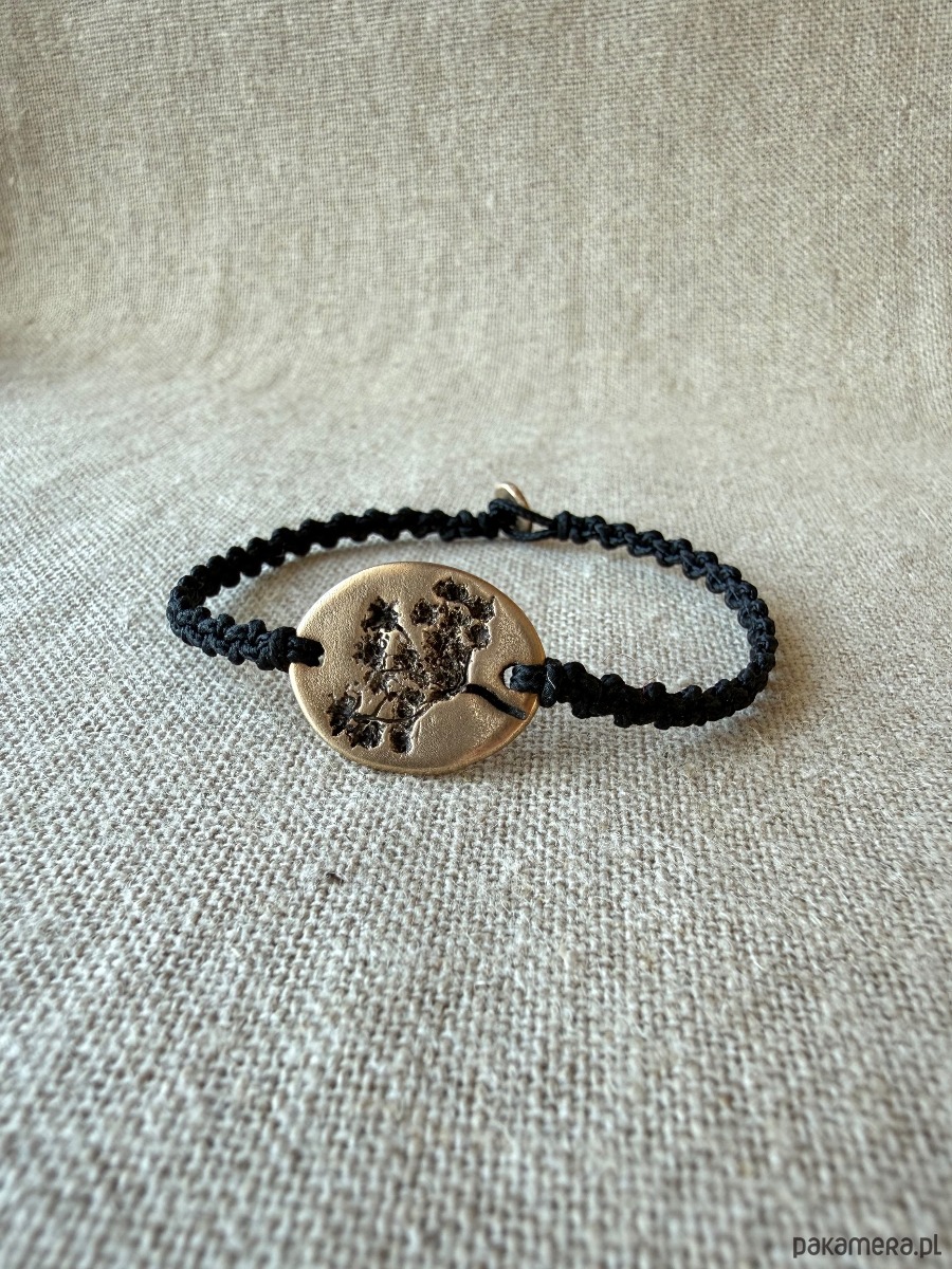 Ręcznie wykonana bransoletka z centralnym detalem z brązu, w którym utrwalony jest odcisk prawdziwej rośliny. Powstała w jednym egzemplarzu - odcisk rośliny, który widzisz, nie powtórzy się w innej sztuce.