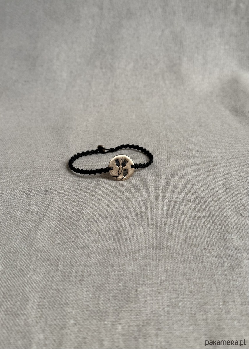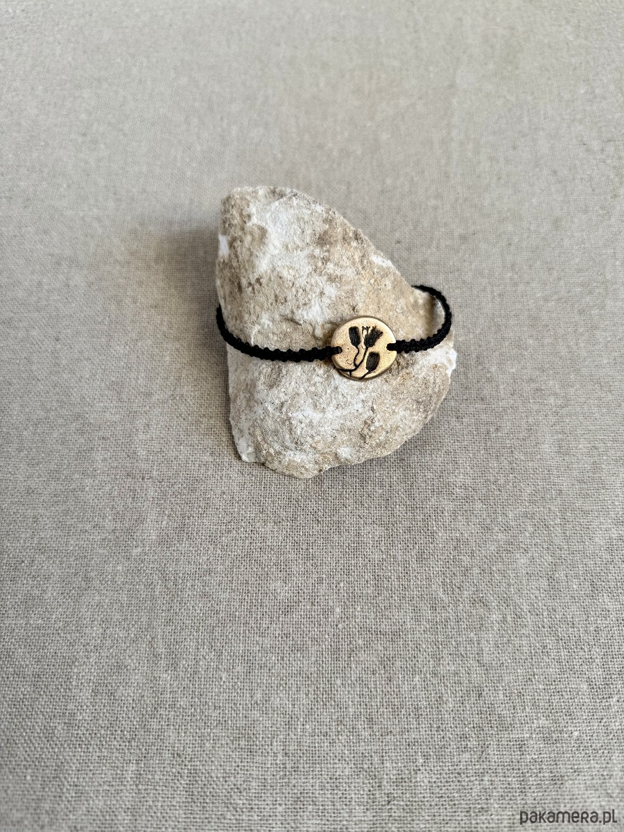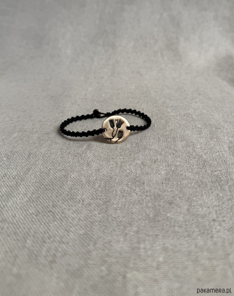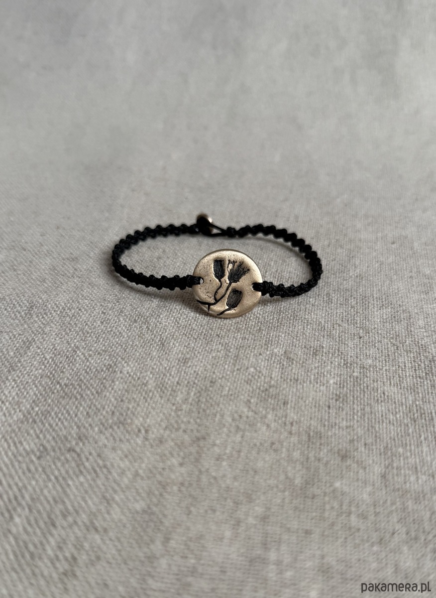 Ręcznie wykonana bransoletka z centralnym detalem z brązu, w którym utrwalony jest odcisk prawdziwej rośliny. Powstała w jednym egzemplarzu - odcisk rośliny, który widzisz, nie powtórzy się w innej sztuce.