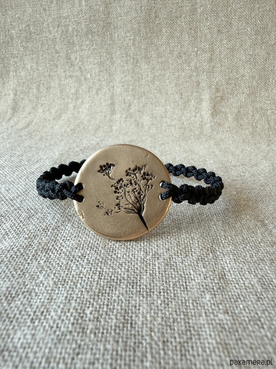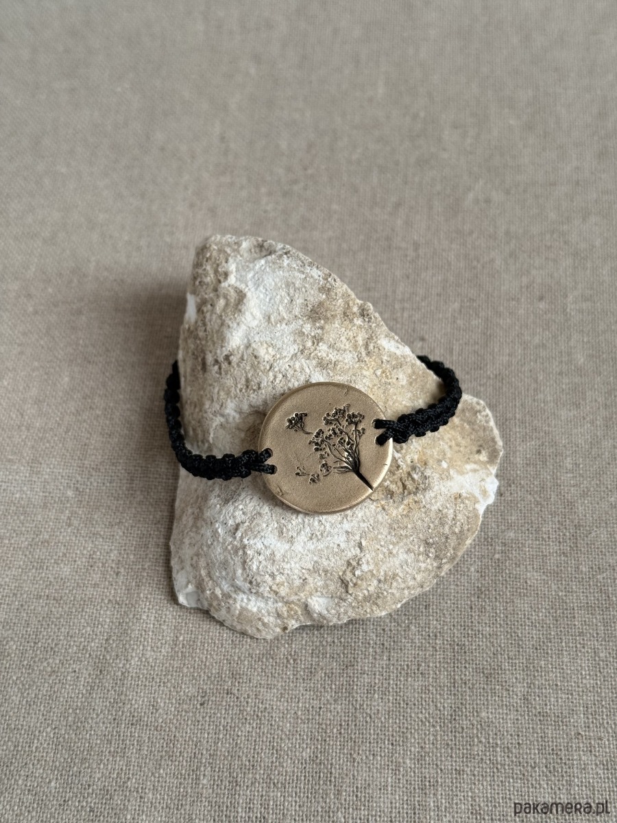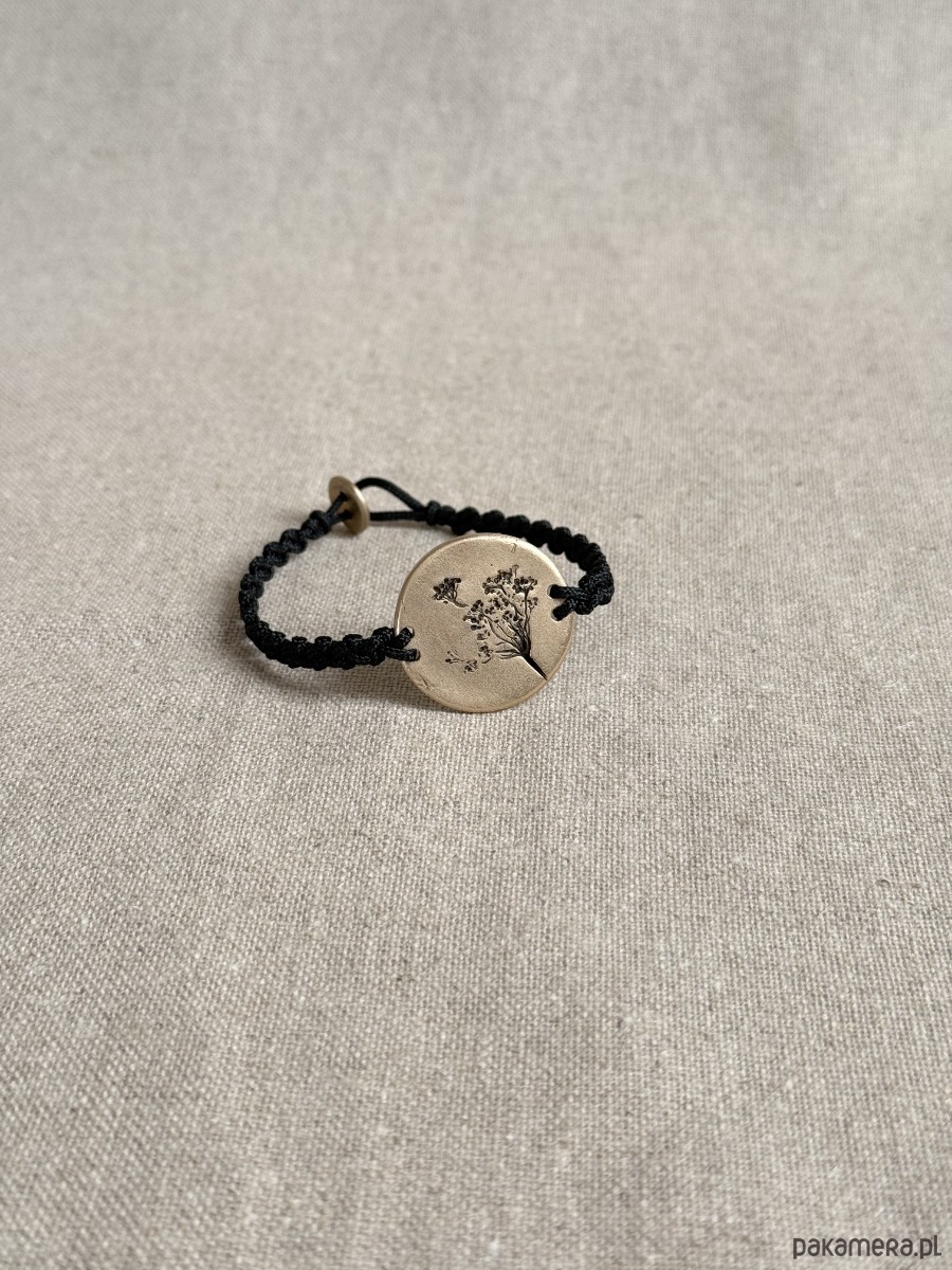 Ręcznie wykonana bransoletka z centralnym detalem z brązu, w którym utrwalony jest odcisk prawdziwej rośliny. Powstała w jednym egzemplarzu - odcisk rośliny, który widzisz, nie powtórzy się w innej sztuce.